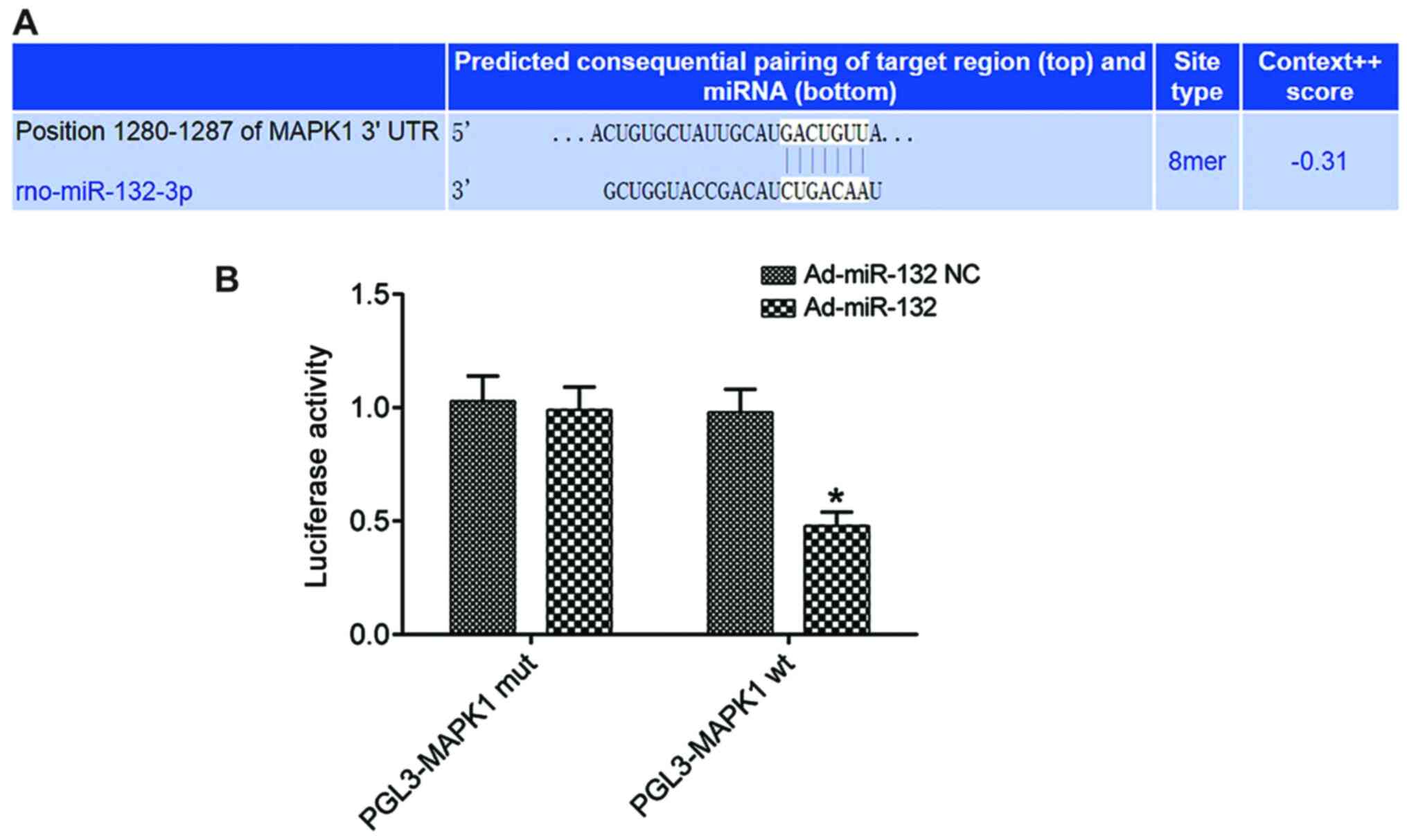 Therefore, we hypothesized that miR-132 may be able to downregulate the expression of MAPK1, thus inhibiting the p38 signaling pathway and protecting the brain tissues of rats with AD from inflammatory injury and apoptosis.