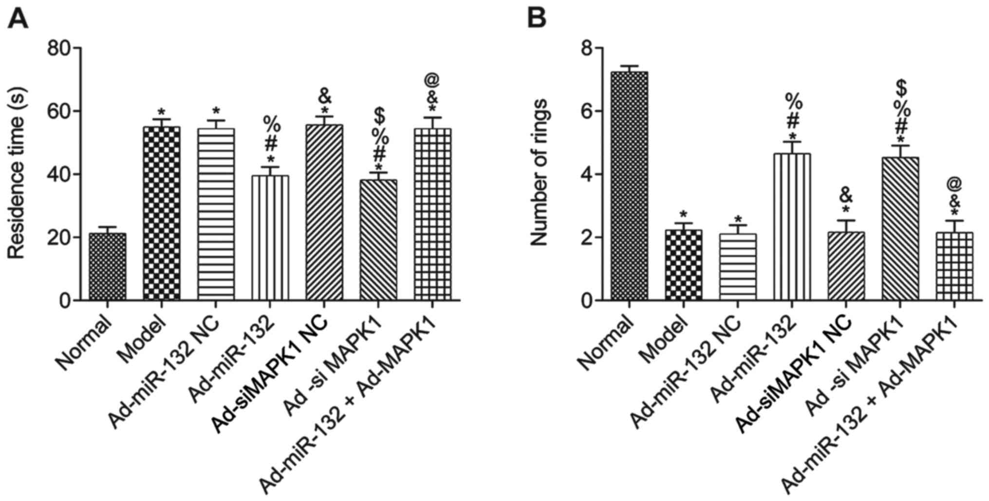 The results from the water maze test demonstrated that compared with the Normal group, the escape latency of rats in all other groups was significantly elevated, and the number of times passing through the rings was significantly decreased (P<0.05; Fig. 3A and B). Furthermore, compared with the Model group, there was no significant difference in Ad-miR-132 NC group, Ad-siMAPK1 NC group and Ad-miR-132 + Ad-MAPK1 group in the two experiments (P>0.05; Fig. 3A and B). However, the Ad-miR-132 group and Ad-siMAPK1 group had significantly decreased escape latency and significantly elevated number of times passing through the rings compared with the Model group (P<0.05; Fig. 3A and B). In addition, compared with the Ad-miR-132 group, the Ad-miR-132 + Ad-MAPK1 group had significantly elevated escape latency and significantly decreased number of times passing through the rings (P<0.05; Fig. 3A and B).