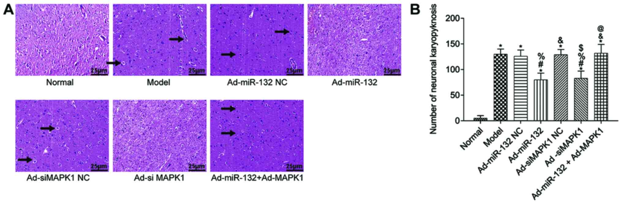 The pathological changes of rat hippocampus tissues were detected by HE staining (Fig. 4). The hippocampus tissue of Normal group showed regular structure and no obvious pathological damage (irregular structure, neuronal shrinkage and deep staining color). However, other groups presented with different degrees of pathological damage, which were less severe in the Ad-miR-132 group and the Ad-siMAPK1 group. The quantification results were consist with above description (Fig. 4B).