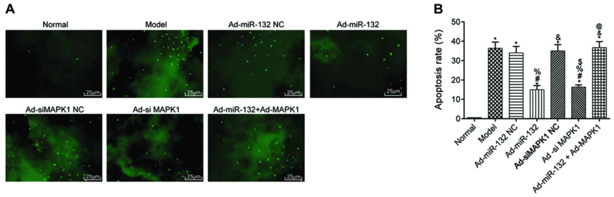 The apoptosis of hippocampal neurons was detected by TUNEL staining (Fig. 5). The results demonstrated that the apoptosis rate of hippocampus neurons was significantly in all groups compared with the Normal group (P<0.05). Compared with the Model group, there were no statistical difference in the apoptotic rate in the Ad-miR-132 NC group, Ad-siMAPK1 NC group and Ad-miR-132 + Ad-MAPK1 group (P>0.05). However, the Ad-miR-132 group and Ad-siMAPK1 group had significantly decreased apoptosis rate compared with the Model group (P<0.05). In addition, compared with Ad-miR-132 group, the apoptosis rate of hippocampus neurons in the Ad-miR-132 + Ad-MAPK1 group was significantly elevated (P<0.05).