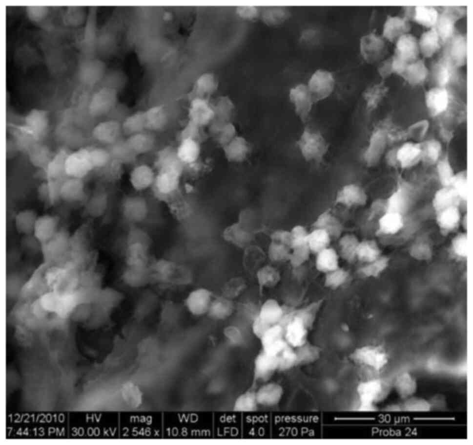 The formation of biofilms in different environments, including clinical situations, has been studied intensively using a great variety of microscopic techniques. SEM is a precious tool for ultrastructural investigation of the general aspect of the biofilm and its characteristics: Bacterial species, individual bacterial cells, the glycocalyx and the presence of inorganic biofilm components. There are various descriptions of SEM use in biofilm assessment on implants, prosthetic devices, catheter, teeth or other solid structures in order to establish the role of biofilms in the persistence of infections (11-14). The conventional SEM technique needs a complicated procedure: Sample fixation in glutaraldehyde and/or in osmium tetroxide, followed by dehydration and coverage (‘sputtering’) of the biofilm with conductive metallic material (Gold, Palladium) or Carbon. The low-vacuum SEM observation method differs from traditional preparation protocols for SEM examination; the method is simple, quick and offers sample protection.