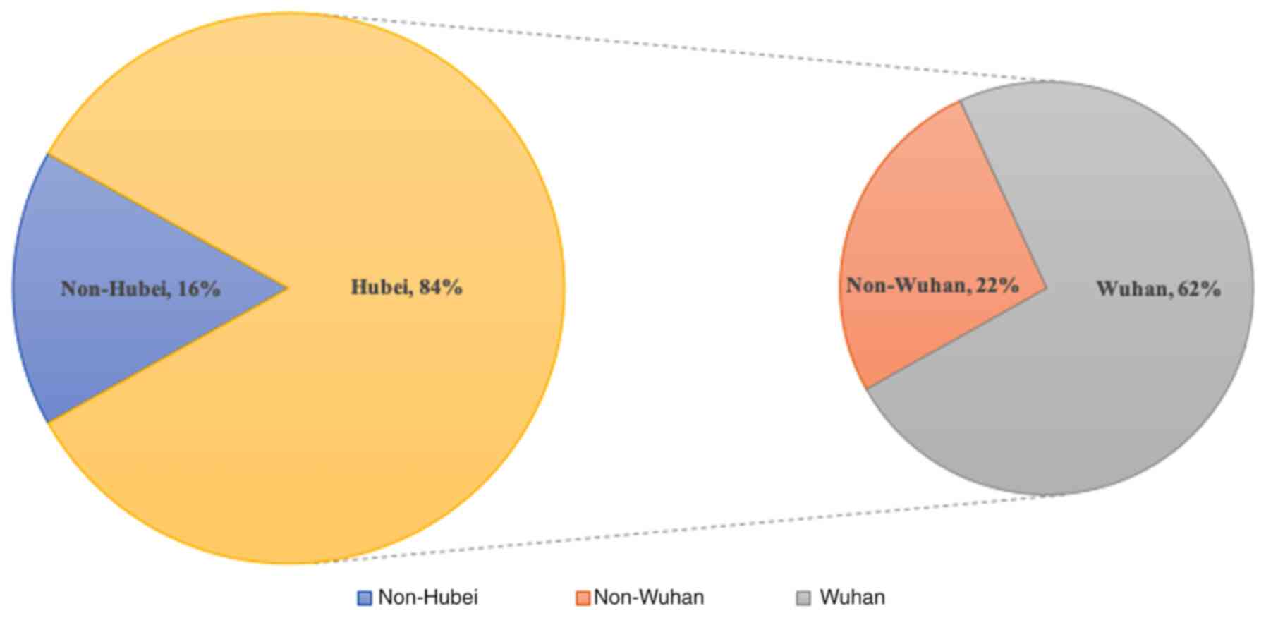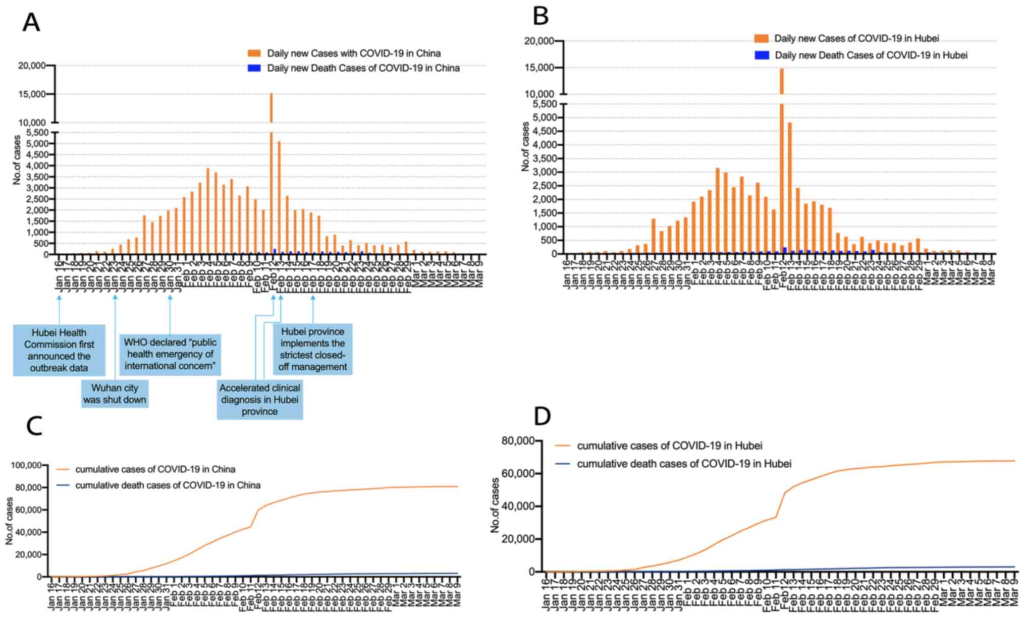 The initial four cases of PUE, with clinical manifestations resembling viral pneumonia, were reported via the domestic PUE surveillance system (6) on December 29, 2020, in Wuhan, Hubei, China (1). At the end of December 2019, the number of reported cases escalated to ~27(7). In late December 2019, several patient BAL samples were sent to sequencing companies for next-generation sequencing (NGS) analysis and the results suggested a type of coronavirus. On December 31, 2019, the China National Health Commission (NHC) sent a team of experts to Wuhan to perform the epidemiological investigation (8). The complete genome sequence of the novel coronavirus was determined by researchers from the Wuhan Institute of Virology, Chinese Academy of Sciences, China (3). On January 5, 2020, the virus was isolated, and further phylogenetic analysis of the sequencing data confirmed the novel coronavirus is a new β genus coronavirus (2,8). The first reported mortality from the virus occurred on January 9, 2020(7). On January 11, 2020, a 69-year-old brain surgery patient who had no respiratory symptoms prior to surgery developed symptoms of fever and was confirmed to have novel coronavirus pneumonia (NCP) (9). He subsequently infected one doctor and 13 nurses in Wuhan Union hospital, which was the first direct evidence of human-to-human transmission. On the same day, Professor Zhang Yongzhen's team from Fudan University in Shanghai first shared the sequence of the new coronavirus genome on the Virological (https://virological.org) and GenBank (https://www.ncbi.nlm.nih.gov) websites. As the reported number of cases from other provinces besides Hubei continued to rise, on January 23, 2020, Wuhan city was locked down by the local government to prevent the disease from spreading. At the end of January 2020, 11,821 patients were confirmed to be infected with COVID-19 worldwide, and there were 3,215 cases in Wuhan (10). The government renovated and built 86 designated hospitals and 16 mobile cabin hospitals and provided more than 60,000 beds to effectively facilitate the admission and treatment of several confirmed patients as soon as possible in Wuhan (11). In addition, the government focused research on detection reagents, and several nucleic acid detection reagents, such as the BGI Group 2019-nCOV Nucleic Acid Detection Kit, were approved for clinical application, which improved the screening of suspected cases. Since strict joint prevention and control measures were taken by the government, the outbreak of the disease was rapidly restrained. The chronological incidence of confirmed COVID-19 cases and COVID-19-associated mortalities are presented in Fig. 1A-D. As of March 9, 2020, 80,924 cases have been confirmed in mainland China, with 3,140 mortalities (10). A total of 84% of cases were in Hubei and Wuhan was the worst-hit area in Hubei (Fig. 2). The case fatality rate is 3.88% (3,140/80,924) worldwide, with 4.46% (3,024/67,760) in Hubei and 4.81% (2,404/49,965) in Wuhan (10).