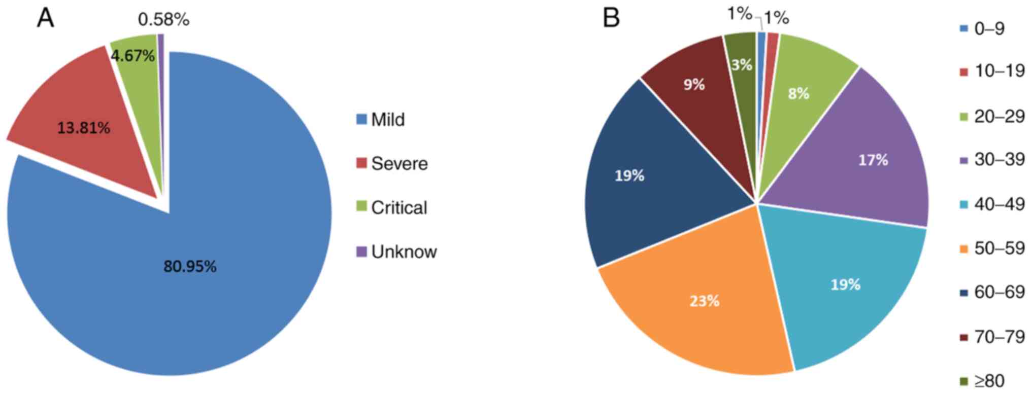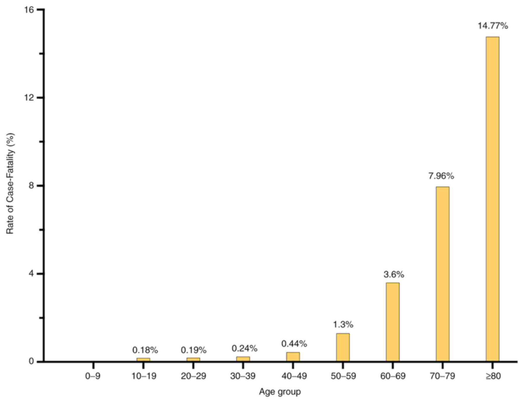 According to a statistical analysis of 44,672 confirmed patients in mainland China by the Chinese CDC epidemiology team (43), 80.95% of the patients had mild disease symptoms, 13.81% were severe cases and 4.67% were critical (Fig. 3A). The age group with highest prevalence was 40-69 years (Fig. 3B). Statistical analysis demonstrated that fatality rate increased with age (Fig. 4). In addition, the case fatality rate was 0.9% in patients with no underlying disease, 6.0% in patients with hypertension, 7.3% in patients with diabetes, 10.5% in patients with other cardiovascular diseases, such as coronary heart disease, 6.3% in patients with underlying respiratory infections and 5.6% in patients with cancer (43). Analysis of this large sample data indicated that the case fatality rate was closely associated with patient age and whether there was any underlying disease.
