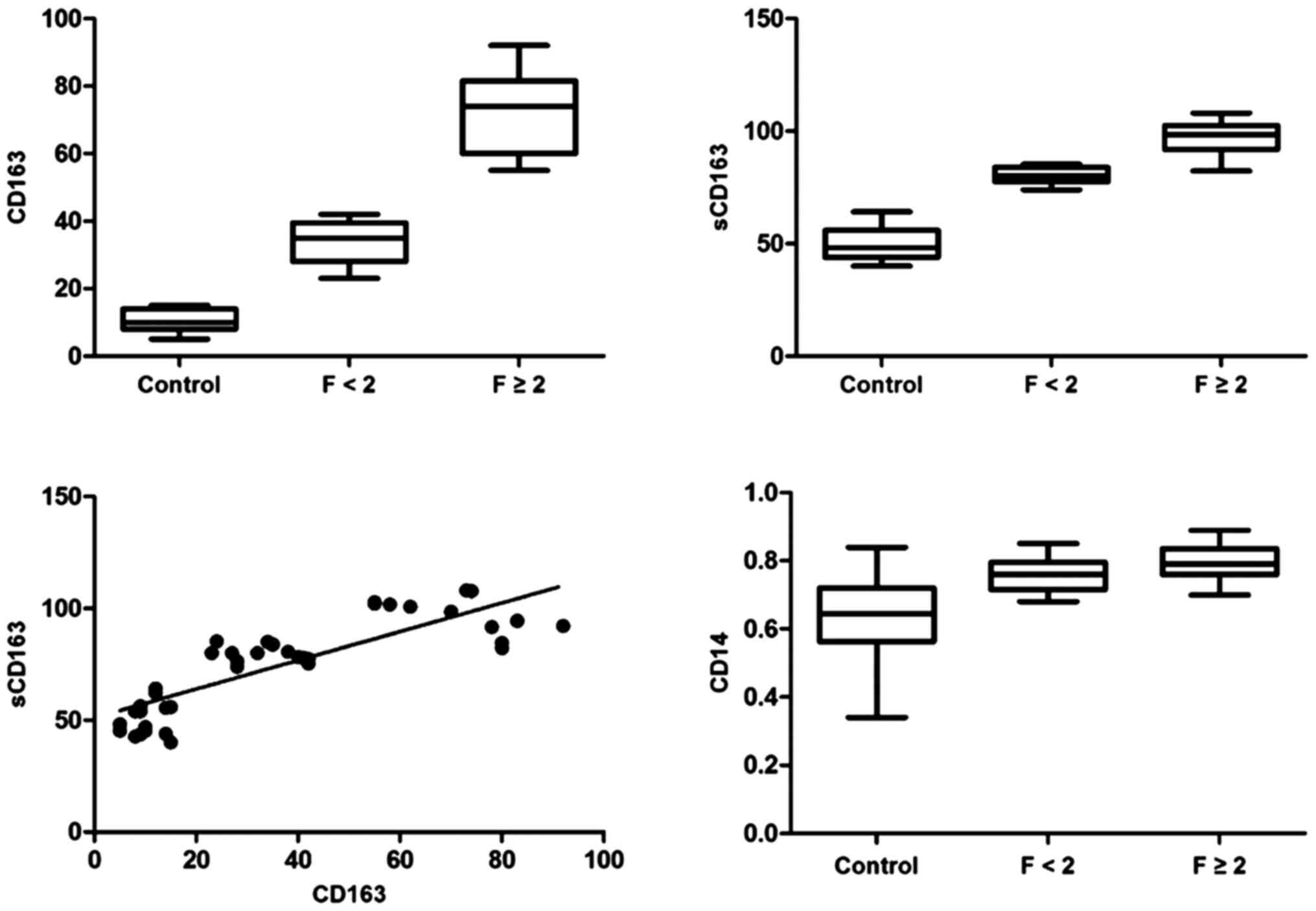 However, to date, the immunopathogenic role of peripheral blood monocytes and intrahepatic macrophages in HCV-associated fibrosis have remained to be fully elucidated. The present study aimed to investigate the effect of monocytes/macrophages and its associated cytokines in the fibrosis of chronic hepatitis C (CHC) by detecting peripheral CD14+ monocyte frequencies and intrahepatic CD163+ macrophage levels in HCV-associated liver fibrosis.