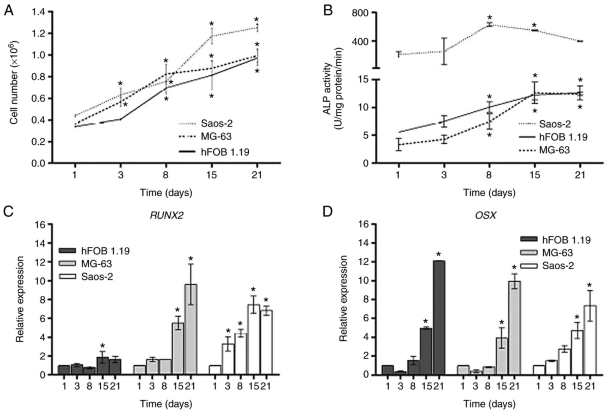 The expression levels of RUNX2 and OSX in the hFOB 1.19, MG-63 and Saos-2 cells at days 1, 3, 8, 15 and 21 of cell culture are illustrated in Fig. 1C and D, respectively. The expression profiles of RUNX2 in MG-63 and Saos-2 cells demonstrated a strong positive correlation between both cell lines, and the expression levels increased significantly in a time-dependent manner during the 21 days of culture, when compared with the day 1 of culture. By contrast, there was no significant increase in the expression levels of RUNX2 during the same days of culture in the hFOB 1.19 cell line (Fig. 1C). With respect to OSX, similar expression profiles were observed in the three cell lines (Table SIII).