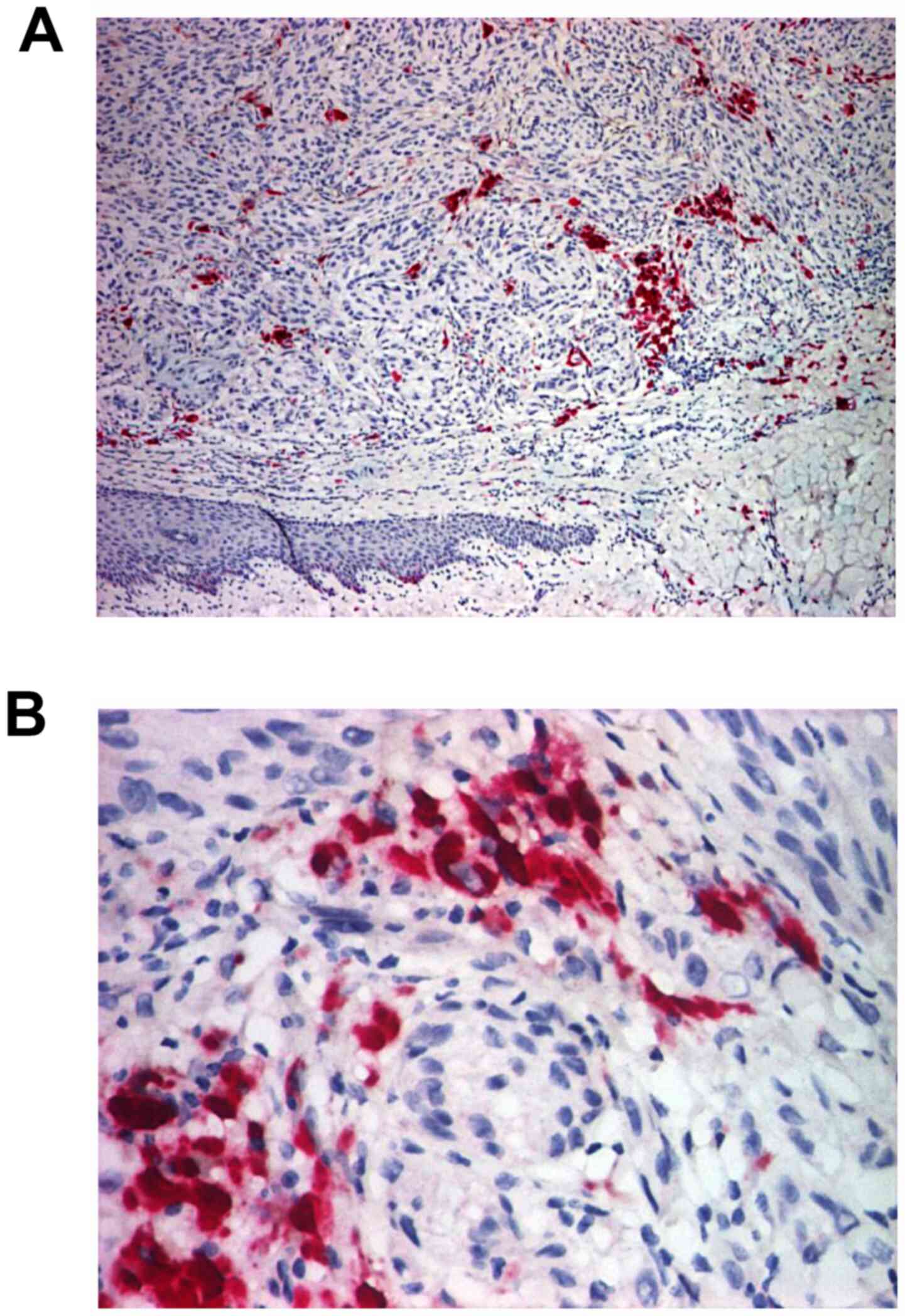 Arber DA, Tamayo R and Weiss LM: Paraffin section detection of the c-kit gene product (CD117) in human tissues: Value in the diagnosis of mast cell disorders. Hum Pathol. 29:498–504. 1998.PubMed/NCBI View Article : Google Scholar | |