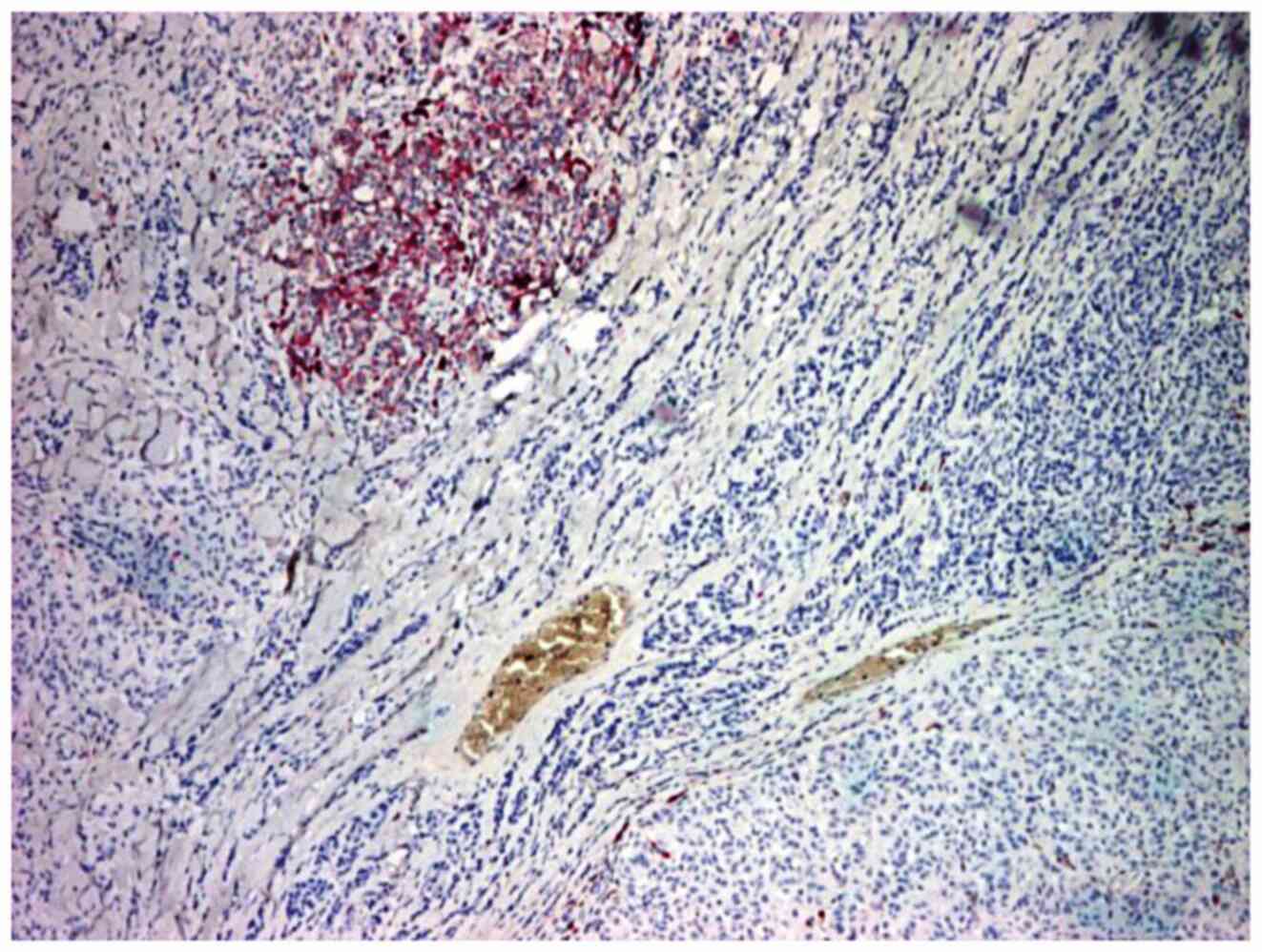 Metastatic MMs (metastases) were considered negative to CD117 in 30% of cases, positive in 10% of tumor cells in 20% of cases, between 10-50% of positive tumor cells in 40% of cases and more than 50% of tumor cells in 10% of cases (Figs. 13-15). The immunomarker intensity in the metastases analyzed was mild and moderate, with no intensive positive metastases detected at CD117 (Tables II and III).