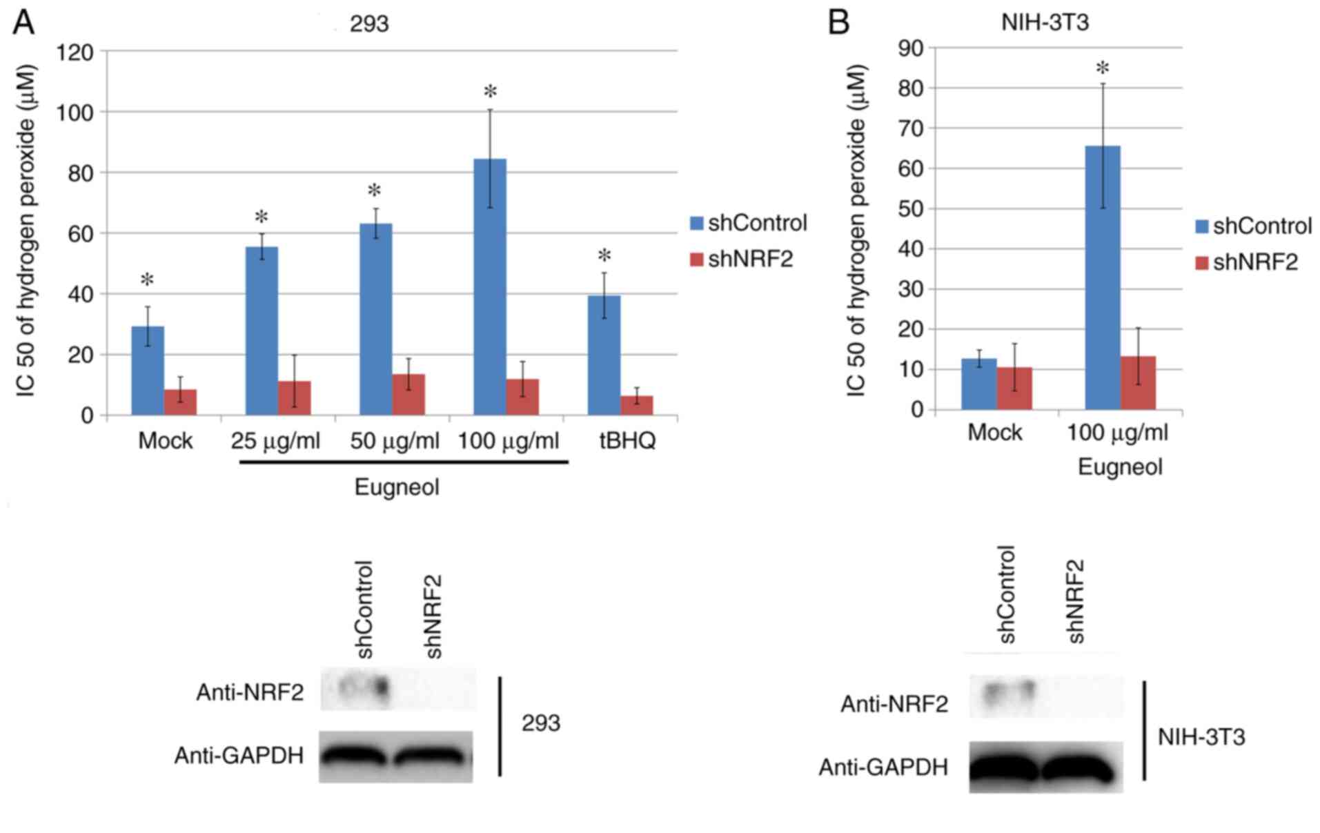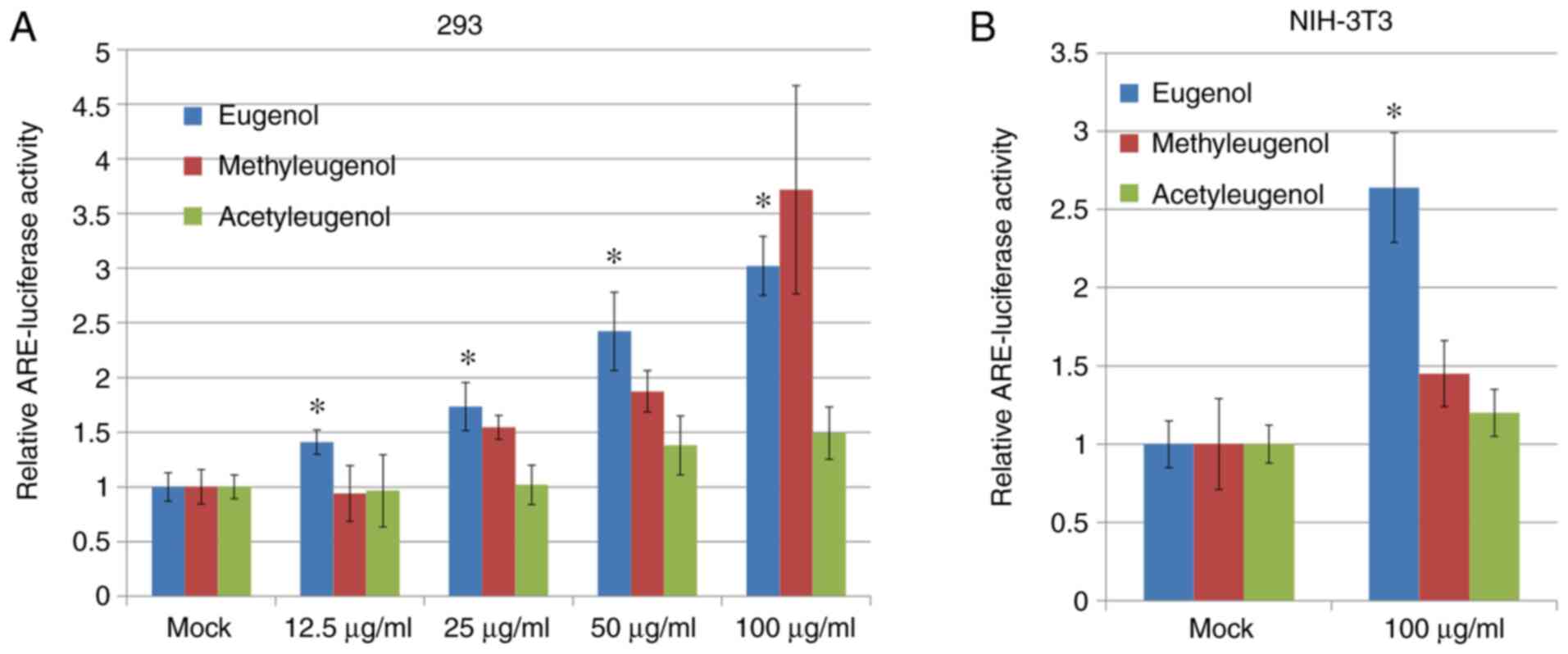 Therefore, the aim of the present study was to investigate the mechanism underlying the ROS-eliminating activity of eugenol and any potential effects on Nrf2 signaling.
