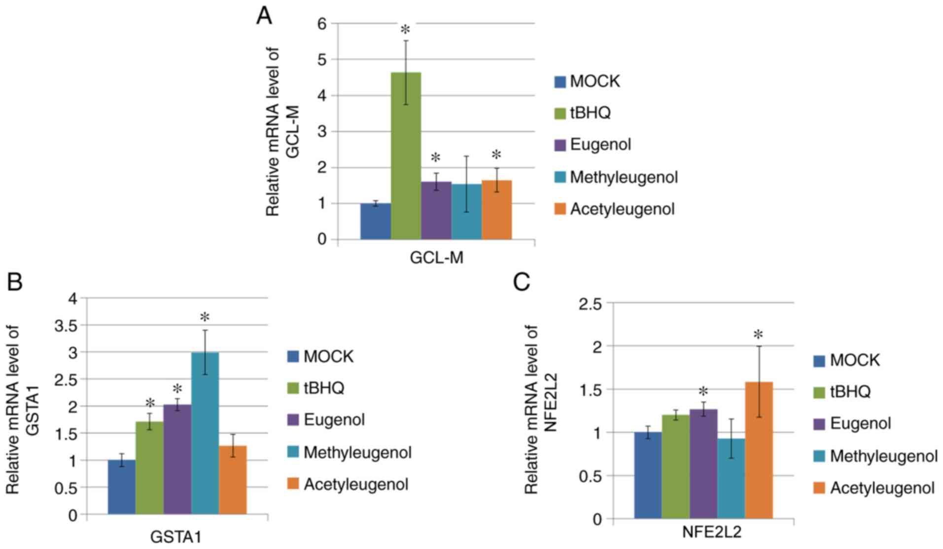 To verify the effect of these three eugenol derivatives on Nrf2-mediated transcription further, RT-qPCR was performed on HEK-293 cells to determine the expression levels of target genes downstream of Nrf2 activation (GCL-M, GSTA1 and NFE2L2). Of the three eugenol derivatives tested, only eugenol treatment significantly increased mRNA expression of all three genes tested, whereas treatment with the other two derivatives only elevated one or two of the Nrf2 target genes tested (Fig. 3A-C).