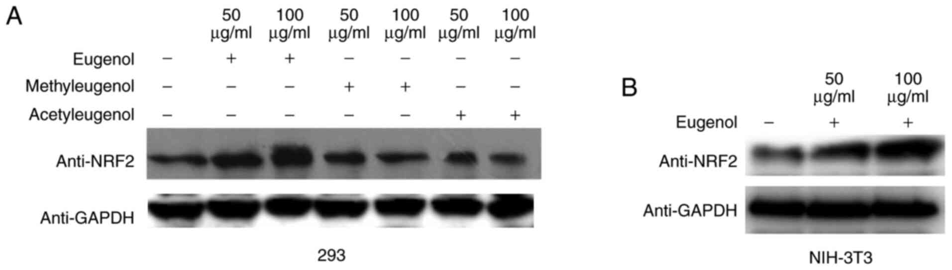 Western blotting revealed that the expression levels of Nrf2 protein were increased by treatment with eugenol, but not with the other two derivatives in HEK-293 cells (Fig. 4A). Similar observations were obtained in NIH-3T3 cells (Fig. 4B). These data suggest that eugenol can promote the expression and transcriptional activity of Nrf2 in HEK-293 and NIH-3T3 cells.