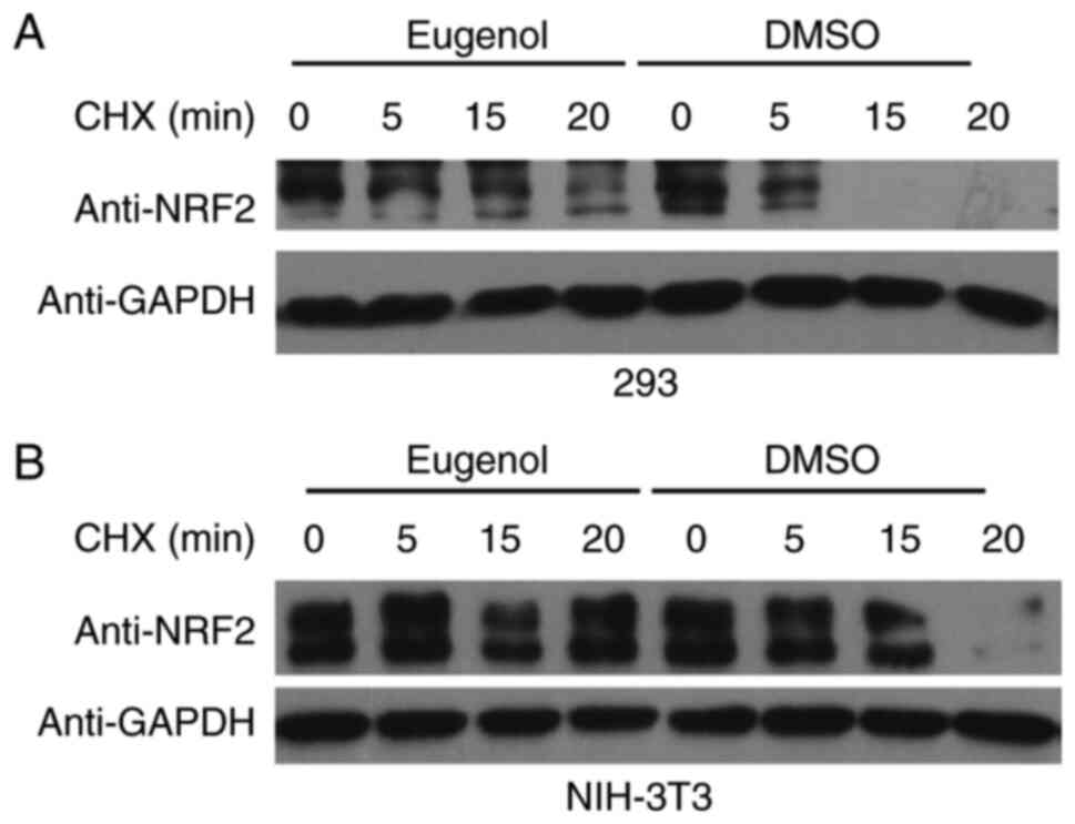 293 cells or NIH-3T3 cells (seeded into 6-well plates at 3x105 cells/well) were transfected with the NC16 pCDNA3.1 FLAG NRF2 plasmid using Lipofectamine® 2000 (Invitrogen; Thermo Fisher Scientific, Inc.). At 24 h following transfection, the cells were incubated with either vehicle or three eugenol derivatives for 6 h before being treated with 30 µg/ml cycloheximide (Sigma-Aldrich; Merck-KGaA), a protein synthesis inhibitor. Cells were harvested for analysis at 0, 5, 15 and 20 min.