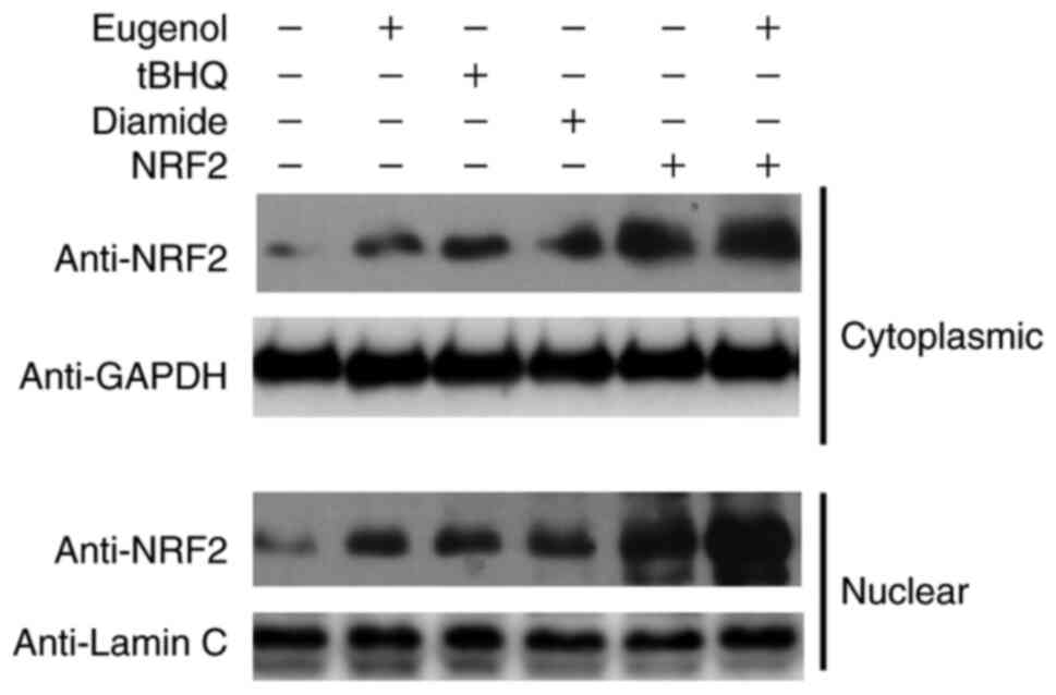 Subsequently, further western blotting was performed to assess Nrf2 expression in the cytosol and nucleus of 293 cells. Diamide and tBHQ was reported to increase NRF2 protein expression (15). The nuclear and cytoplasmic content of Nrf2 was found to be markedly increased following treatment with eugenol (Fig. 7). Taken together, these observations suggest that eugenol was able to induce the stabilization and nuclear accumulation of Nrf2.