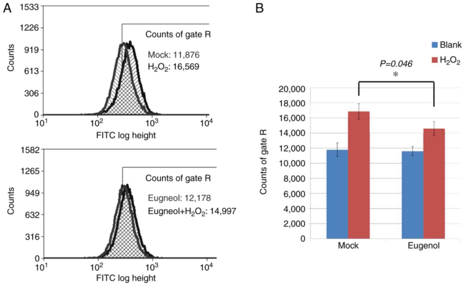 HEK-293 cells or NIH-3T3 cells were seeded into 6-well plates at a density of 3x105 cells/well in fully supplemented DMEM for 24 h before they were treated with 50 µg/ml eugenol for 6 h at 37˚C. Untreated and eugenol-treated cells were subsequently harvested in fully supplemented DMEM, centrifuged for 5 min at 200 x g and 4˚C and suspended in Dulbecco's PBS (DPBS) containing the 10 µM CM-H2DCFDA dye (Invitrogen; Thermo Fisher Scientific, Inc.) with or without 50 µM H2O2, at 37˚C in the dark for 30 min. The cells were then pelleted and resuspended in ice-cold DPBS prior to the addition of propidium iodide (1 µg/ml) to the cells for 5 min at room temperature, for analysis by flow cytometry (MoFlo® flow cytometer; Beckman Coulter, Inc.) by measuring fluorescence emission at 525 nm (PI) following excitation at 488 nm (DCFDA/FITC). Since live cells are impermeant to propidium iodide, only cells negative for propidium iodide staining were assessed for ROS production. Data was analyzed by Kaluza C Analysis software 2.1 (Beckman Coulter, Inc.).