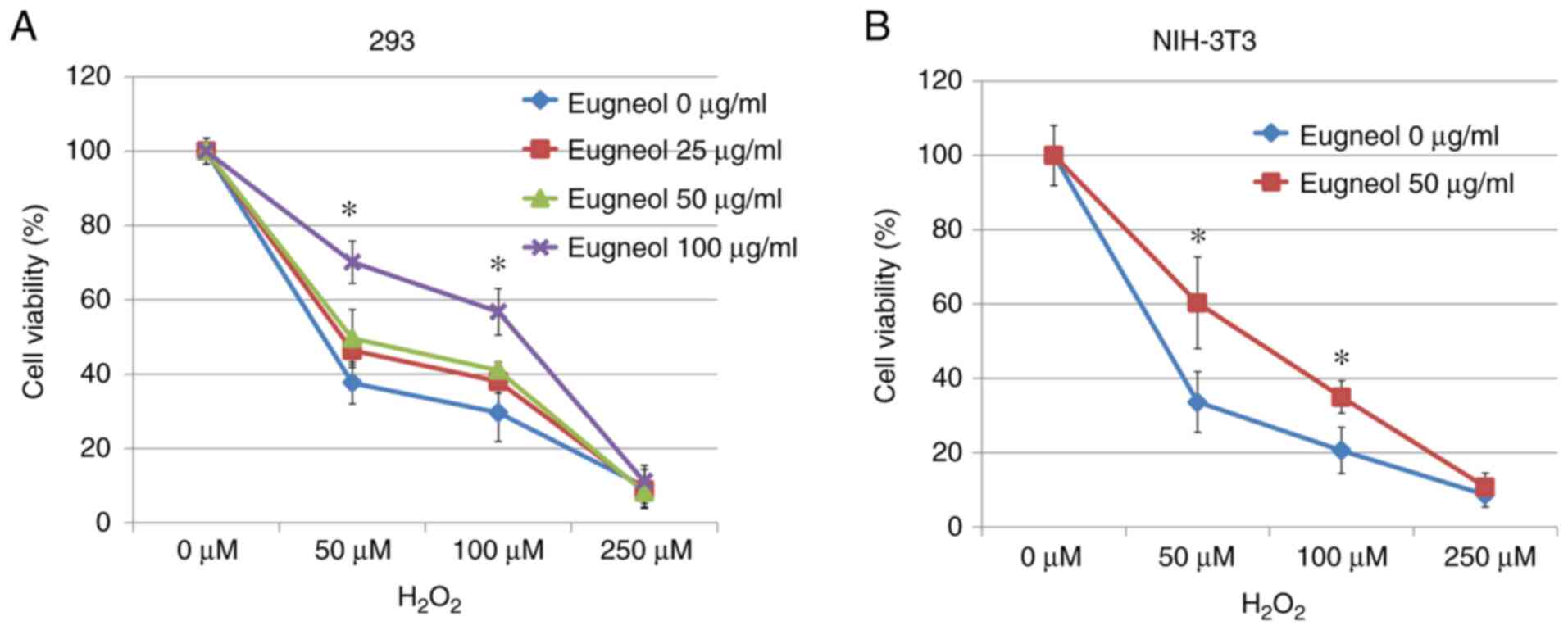 MTT assay was used to assess the protective effects of eugenol on H2O2-treated 293 and 3T3 cells. Eugenol was found to significantly increase cell viability in the presence of H2O2 (Fig. 9). These results suggest that eugenol protects cells from H2O2-induced cytotoxicity.