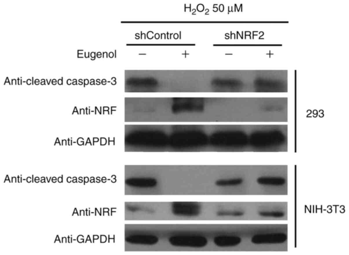 To study the role of increased Nrf2 expression and transcriptional activity in the enhanced cell viability induced by eugenol, Nrf2 expression was knocked down using plasmids expressing short hairpin RNA (Fig. 11A). Nrf2 knockdown significantly abrogated the protective effects of eugenol on HEK-293 and 3T3 cells following exposure to H2O2 (Fig. 10). In addition, western blot analysis of cleaved caspase-3, a key regulator of apoptosis, suggested that eugenol treatment abolished the pro-apoptotic activity of H2O2 on HEK-293 and 3T3 cells, as evidenced by reduced levels of cleaved caspase-3 in cells transfected with shControl after H2O2 treatment. However, the expression levels of cleaved Caspase-3 after exposure to H2O2 was not affected by eugenol treatment following Nrf2 knockdown (Fig. 11B). These results suggest that increased Nrf2 expression is required for the protective effects of eugenol on H2O2-induced oxidative stress.