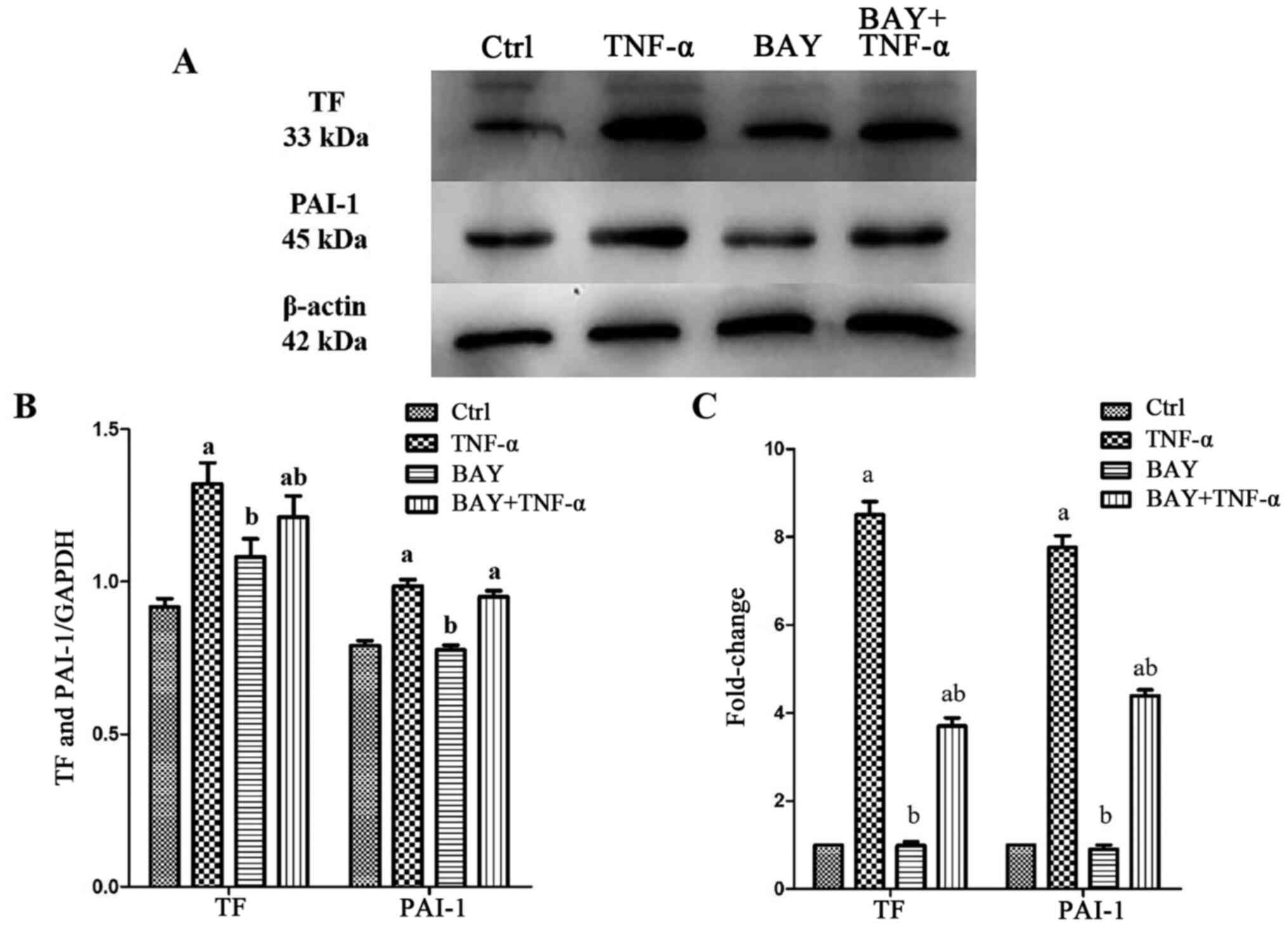 The levels of TF and PAI-1 were measured in cell supernatants using ELISA. The secretion of TF and PAI-1 significantly increased following TNF-α stimulation compared with controls. In the cells in the BAY group, this difference was not obvious. However, pretreatment with BAY11-7082 (i.e, BAY + TNF-α group), partially reduced the increase of TF and PAI-1 secretions induced by TNF-α stimulation, although they are significantly higher than the control group (Fig. 2).