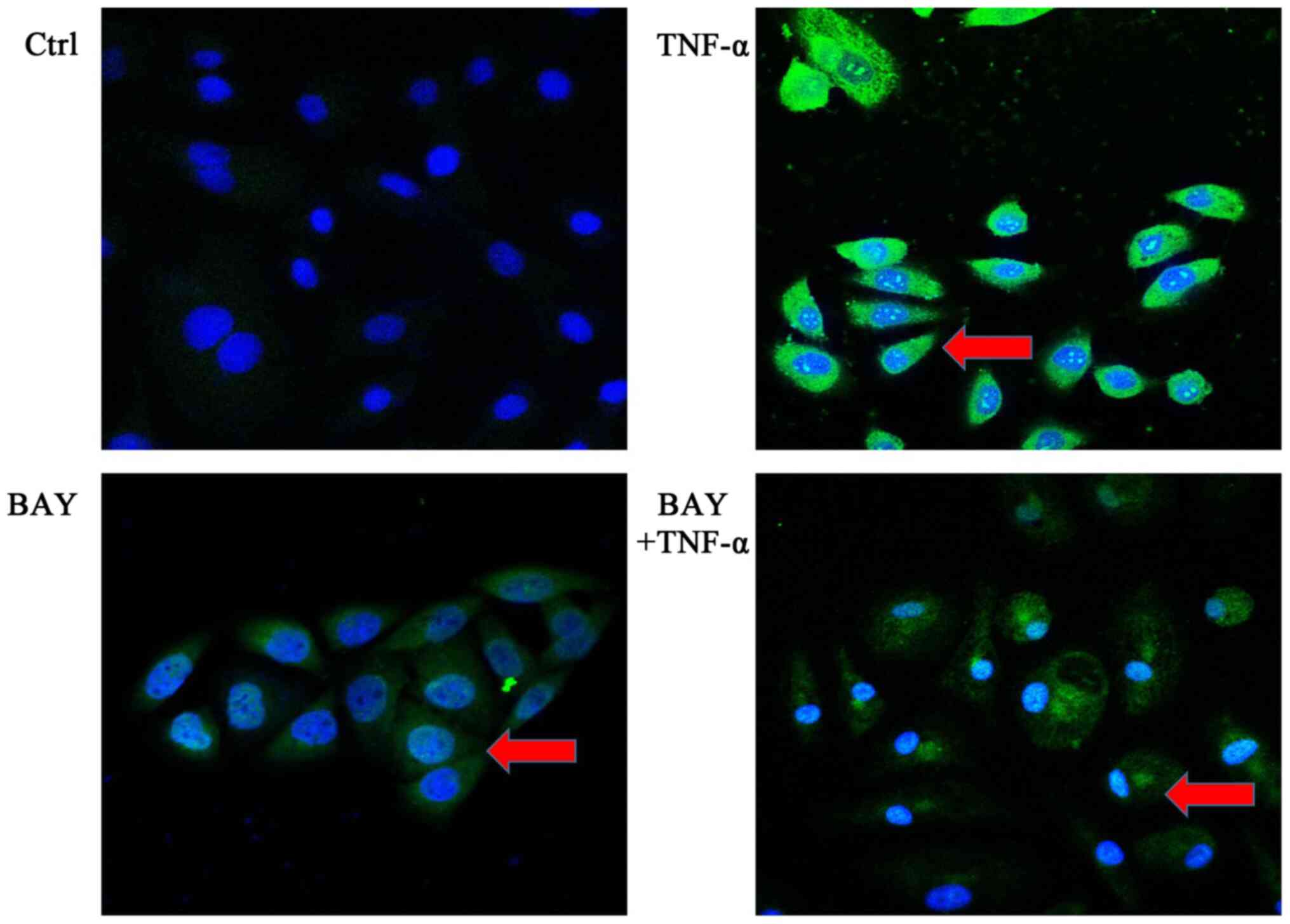 Immunofluorescence staining was used to determine the cellular localization of p65. The results indicated that TNF-α stimulation resulted in increased green fluorescence staining in the nucleus, indicating an increase in translocation of p65 from the cytoplasm to the nucleus. In the cells in the BAY group, this difference was not obvious compared with cells in the ctrl group. However, in the cells that were pretreated with BAY11-7082 (the BAY + TNF-α group), the degree of green fluorescence staining of p65 in the nucleus of AECII was weakened, demonstrating that nuclear translocation of p65 was inhibited by BAY11-7082 pre-treatment (Fig. 4).