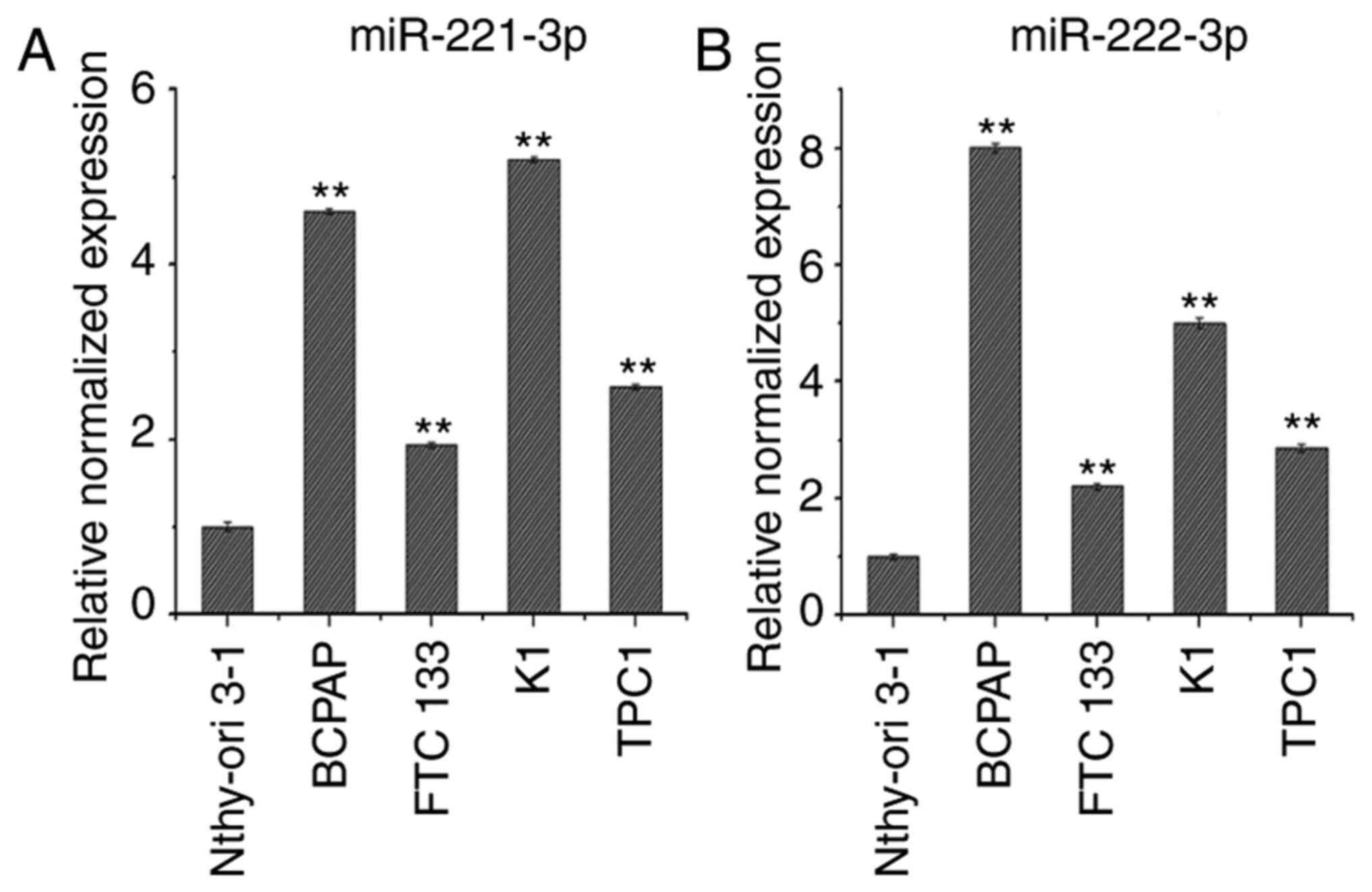 Jikuzono T, Kawamoto M, Yoshitake H, Kikuchi K, Akasu H, Ishikawa H, Hirokawa M, Miyauchi A, Tsuchiya S, Shimizu K, et al: The miR-221/222 cluster, miR-10b and miR-92a are highly upregulated in metastatic minimally invasive follicular thyroid carcinoma. Int J Oncol. 42:1858–1868. 2013.PubMed/NCBI View Article : Google Scholar | |
