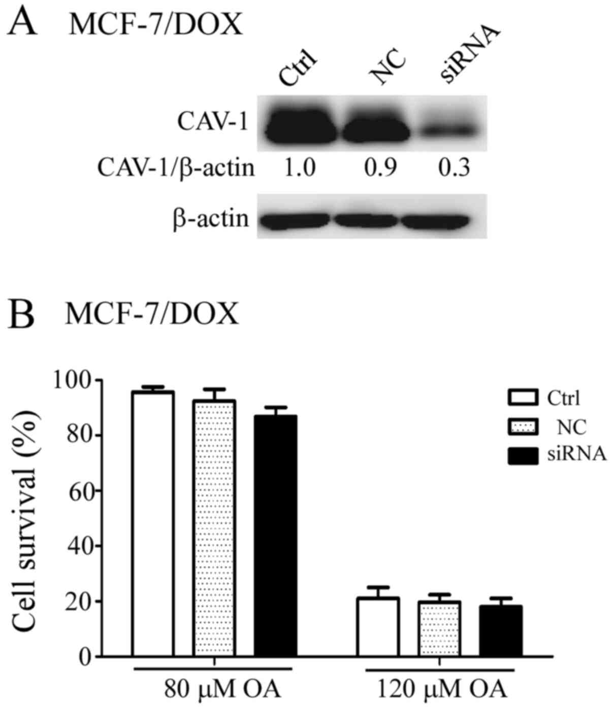 Overexpression of CAV-1 in HL-60 cells increases their sensitivity to OA, as demonstrated in a previous study (17). In the present study, upregulation of CAV-1 was found in MCF-7/DOX cells compared with that in their parental MCF-7 cells (Fig. 1A). Therefore, reduction in CAV-1 expression in MCF-7/DOX cells may enhance their sensitivity to OA. Therefore, CAV-1 expression was successfully downregulated in MCF-7/DOX cells using RNA interference (Fig. 2A). However, there was no significant difference in the sensitivity to OA between the scrambled siRNA-transfected and the CAV-1 siRNA-transfected MCF-7/DOX cells after the cells were treated with 80 and 120 µM OA for 48 h (Fig. 2B).