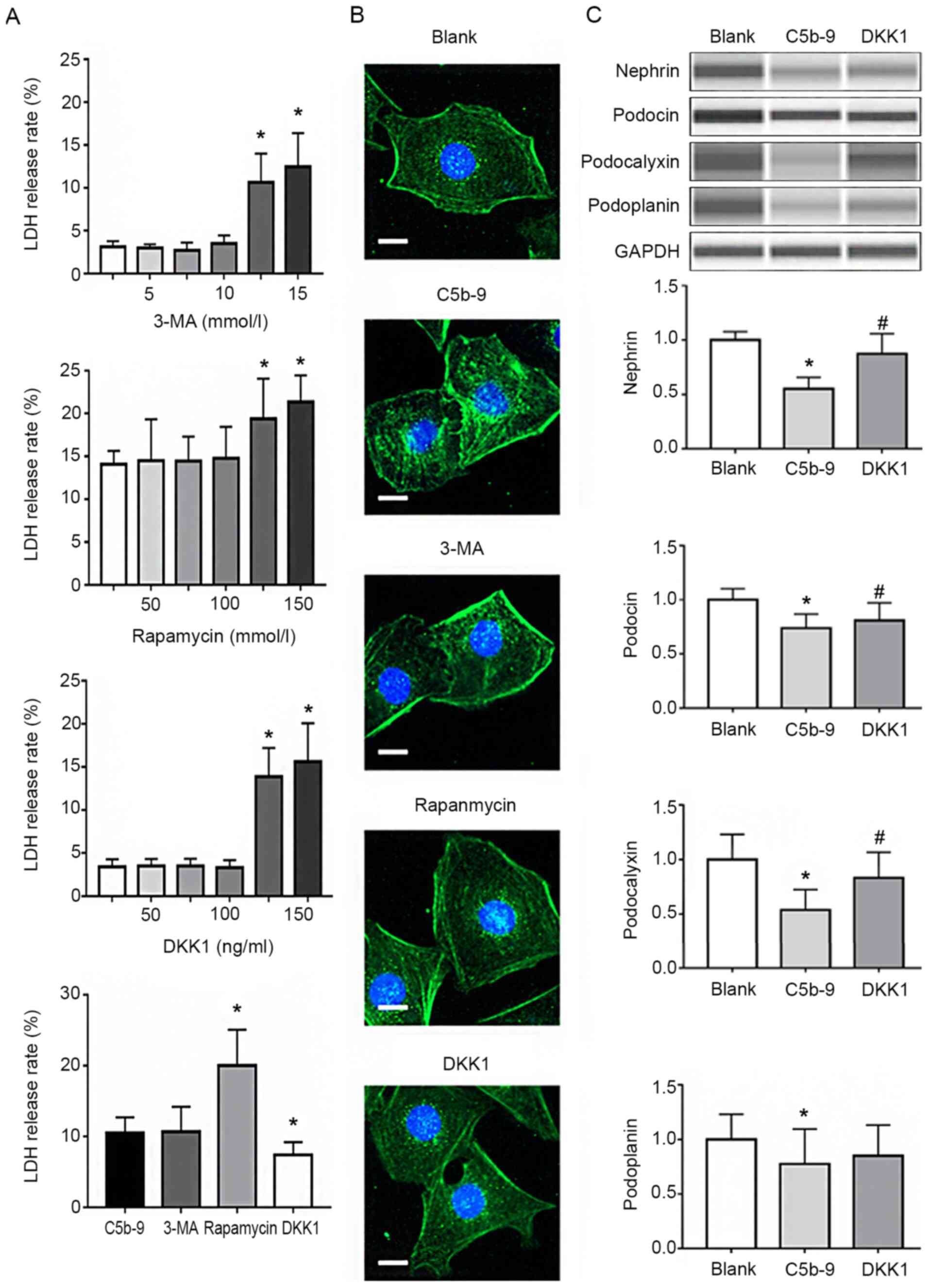 In order to better understand the protective effects of the autophagy and Wnt/β-catenin pathways on podocytes, 3-MA, rapamycin and DKK1 were used to preculture podocytes that were subsequently damaged using C5b-9. Firstly, LDH release rates of podocytes incubated with different concentrations of 3-MA, rapamycin and DKK1 were calculated, and then the maximum concentration possible with minimal cell damage to cells was selected. As shown in Fig. 2A, the concentration of 3-MA used for subsequent experiments was 10 mmol/l, 100 nmol/l for rapamycin and 100 ng/ml for DKK1. Subsequently, the above concentrations were used to pretreat the podocytes prior to C5b-9 injury, and the LDH release rates were measured. DKK1 reduced the release rate of LDH in comparison to that with C5b-9 alone, whereas 3-MA and rapamycin did not. This suggested that 3-MA and rapamycin pretreatment did not protect podocytes, whereas DKK1 pretreatment did (Fig. 2A). Immunofluorescence staining of podocin was used to detect changes in the treated cells. The results of injury analysis were consistent with LDH release rates (Fig. 2B). Finally, WES was used to determine the effects of DKK1 on podocin, nephrin, podoplanin and podocalyxin in podocytes. The results indicated that DKK1 protected podocytes from damage caused by C5b-9 (Fig. 2C).