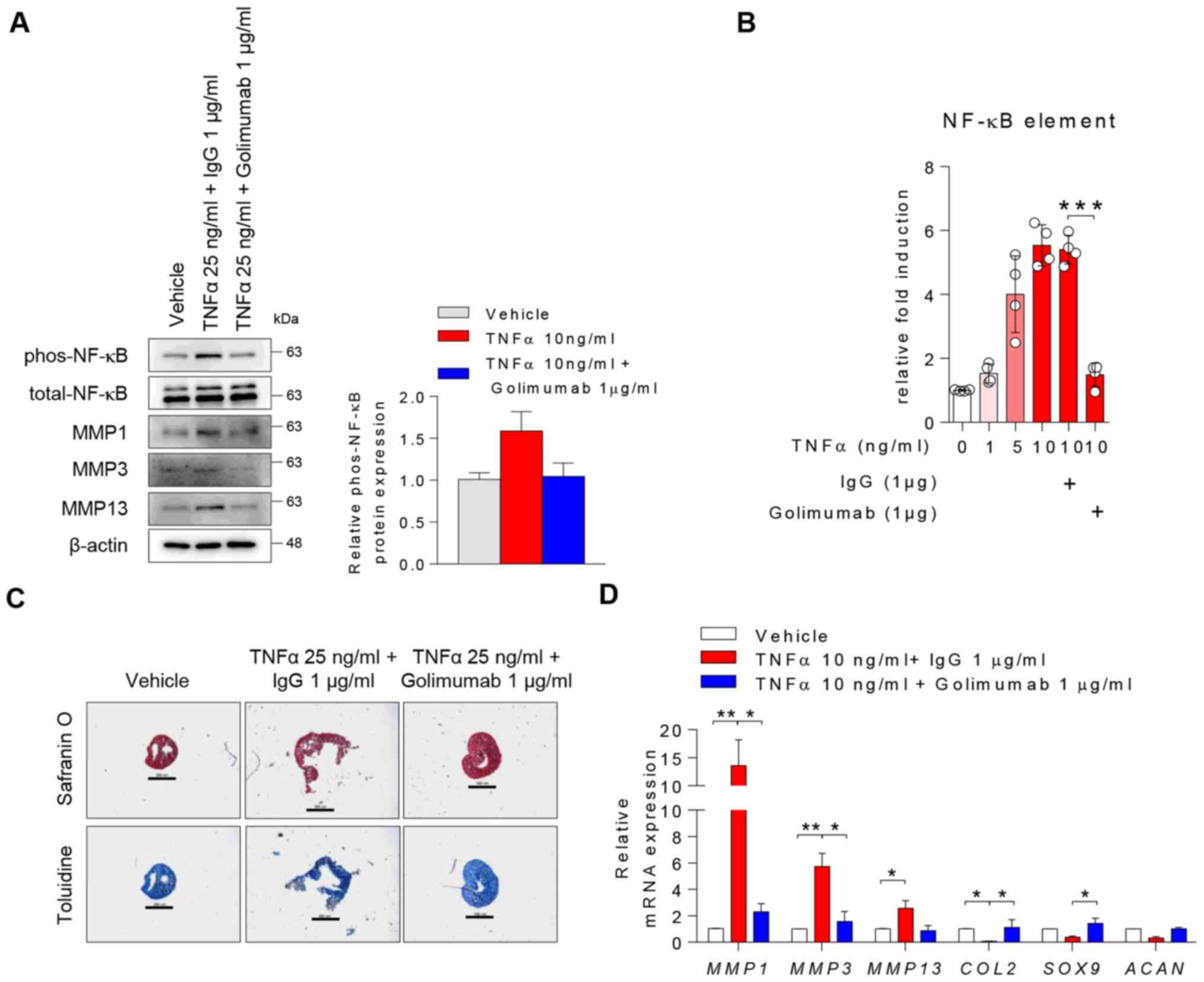 To determine whether the modulation of TNFα affected catabolic and anabolic gene expression levels, human chondrocytes were treated with 1 µg/ml golimumab (a TNFα blocker) in the presence of TNFα. TNFα stimulation upregulated p-NF-κB, MMP1, MMP3 and MMP13 in chondrocytes, whereas treatment with golimumab impeded these changes mediated by TNFα (Fig. 5A). In the line with Fig. 5A, changes in TNF-mediated p-NF-κB were quantified (Fig. 5A, right panel). TNFα activated the WT NF-κB promoter in a dose-dependent manner but blocking TNFα diminished this activation (Fig. 5B). In addition, treatment with 10 or 30 µM BAY, an NF-κB inhibitor, suppressed TNFα-mediated induction of MMP1, MMP3 and MMP13 mRNA expression in chondrocytes (Fig. S4). During chondrogenic differentiation, treatment with the TNFα blocker interfered with the destructive effect of TNFα on physical changes of chondrogenesis (Fig. 5C) and its mRNA expressions (Fig. 5D). Therefore, blocking TNFα may attenuate TNFα-driven cartilage matrix degradation in inflammatory arthritis.