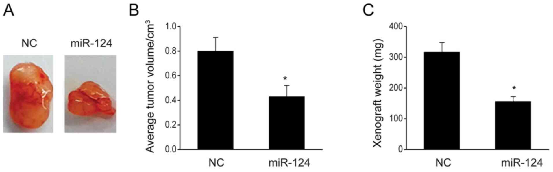 In order to investigate how miR-124 affects in vivo tumor growth, the present study implanted U87 cells into nude mice. After 30 days, the mice were sacrificed to measure the weight and volume of their tumors. It was revealed that miR-124-overexpressing mice exhibited a significant decrease in the tumor volume and weight compared with the NC-transfected U87 cells (Fig. 6A-C), suggesting that miR-124 suppresses glioma carcinogenesis in vivo.