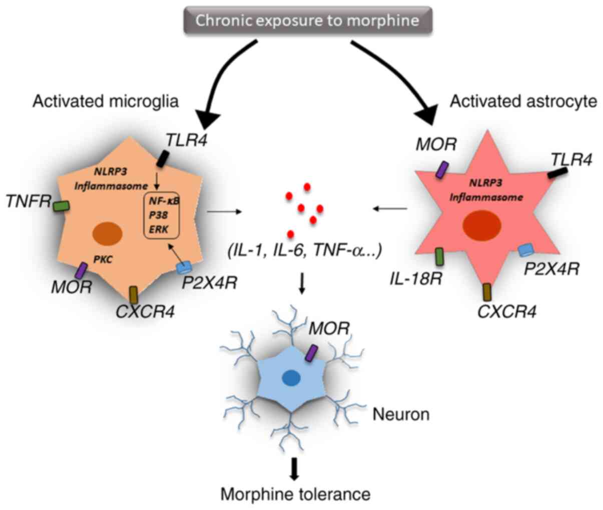 Glial cells are activated by cytokines in the central nervous system and release other mediators that trigger neuroinflammation (70). IL-1β, a key proinflammatory cytokine, plays an important role in host defence and inflammation and is a critical mediator of inflammatory pain and opioid analgesia (71). In a mouse study, the administration of IL-1β abolished morphine analgesia, and genetic or pharmacological inhibition of IL-1 signalling prevented the development of morphine tolerance (72). Prolonged morphine treatment was indicated to induce glial TLR4 activation, which promoted neurotoxicity and amplified nociceptive signalling in the spinal cord (73). Moreover, chronic morphine use activated TLR4 signalling in the brain, especially in the periaqueductal grey region, resulting in changes in inflammatory cytokine expression, thereby inducing glutamatergic signalling and eventually leading to opioid tolerance (74). Expression of IL-1β could also be induced by morphine via activated microglia, which disrupted glutamate homeostasis by downregulating glutamate transporter 1 and increasing glutamate, thereby triggering the release of ATP from the glia. These events may contribute to excitotoxicity and chronic inflammation, which leads to continued morphine discontinuation (75). Interestingly, IL-1β treatment significantly upregulated MOR mRNA expression in various cell types, including primary astrocytes, neurons and microvascular endothelial cells, which further supports the interaction between IL-1β and the opioid system (76,77). In addition, other inflammatory cytokines, such as TNF-α, IFN-α, IL-4 and IL-6 are also associated with MOR expression in neural and immune cells (78). IL-1β mediates its function through IL-1 receptor type 1 protein (78). Previous studies have indicated that IL-1β stimulation activated downstream signalling, including the janus kinase-STAT, MAPK and NF-κB pathways, which altered MOR transcriptional level (79,80). Chronic morphine treatment has been indicated to upregulate purinergic P2X7 receptor (P2X7R) and increase the expression of IL-18 in the microglia, IL-18 receptor in astrocytes and protein kinase Cγ (PKCγ) in neurons of the spinal dorsal horn. Thus, targeting the P2X7R/IL-18/PKCγ cascade may present a novel therapeutic target for reducing and understanding morphine tolerance in the clinical management of chronic pain (81).