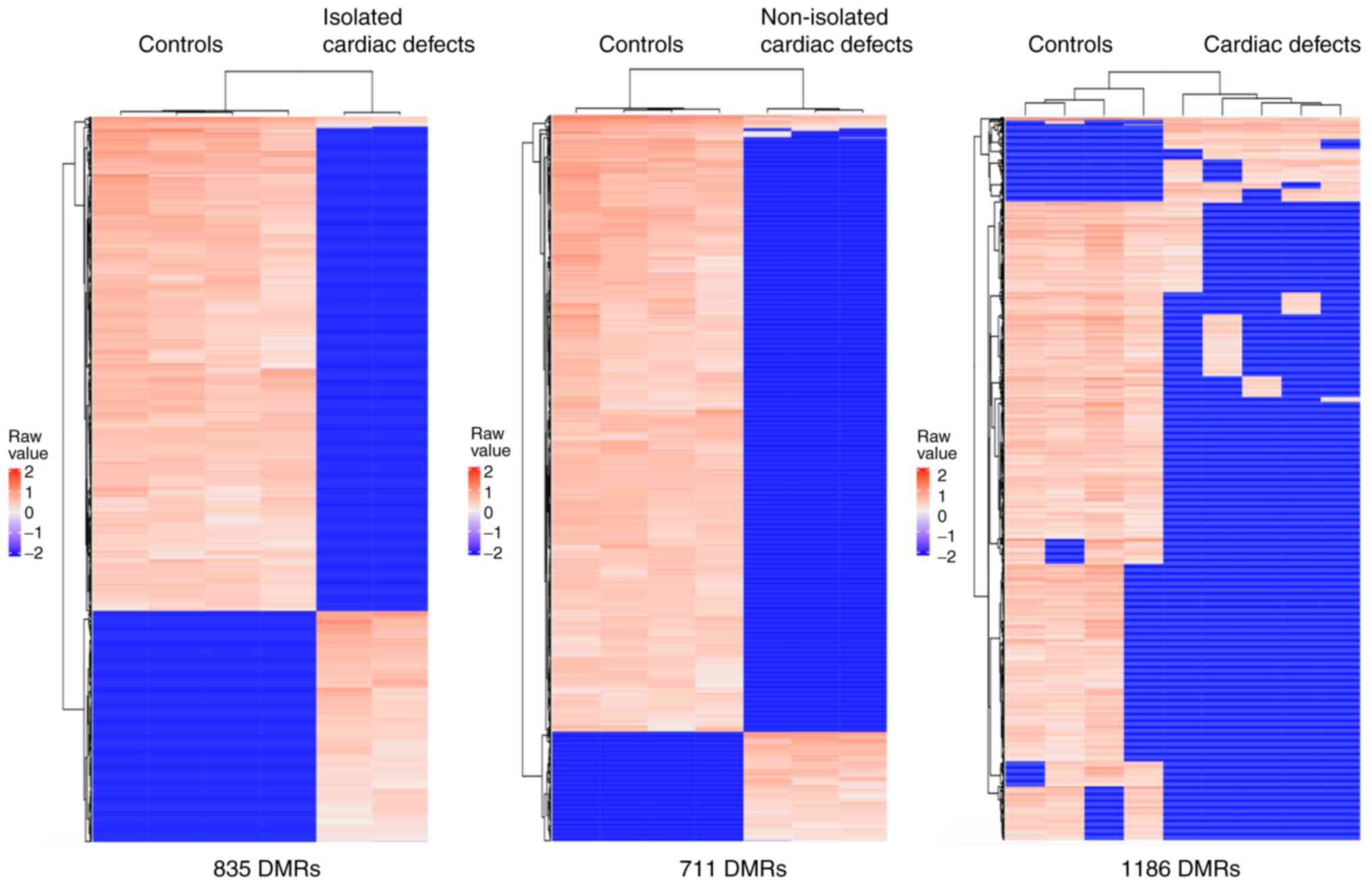 Accumulating evidence suggests that abnormal epigenetic regulation could have an important role in the development of cardiac defects (4). DNA methylation, defined as methylation of cytosine residues at CpG dinucleotides, is one of the most important epigenetic modifications and is involved in a variety of biological process. DNA methylation patterns are continuously changing during early mammalian development, from germlines through to the postnatal stage. Disturbance of these methylation patterns could lead to abnormal development and diseases, including congenital syndromes of immunodeficiency, growth phenotypes, neurodegeneration, and cancer (5). Recently, DNA methylation abnormalities were shown to be a biomarker for the prediction of congenital heart disease and have been explored in neonatal blood spots (6) and placental tissues (7,8). Additionally, in heart tissue samples from patients 1-48 months in age, decreased whole-genome methylation levels, implied by analyzing long interspersed nucleotide element (LINE)1 methylation status, was associated with increased risk of tetralogy of fallot (TOF) (9). Changes in DNA methylation at the promoter and intron regions of several heart development-related genes, including NK2 homeobox 5, GATA binding protein 4, heart and neural crest derivatives expressed 1, and SWI/SNF-related matrix associated actin-dependent regulator of chromatin subfamily a member 4, and their association with the expression of these genes, have also been reported in the myocardium of children with ventricular septal defect (VSD), TOF, and double-chambered right ventricle (10,11). However, limited studies have examined DNA methylation during the fetal period, a key stage when cardiac structures are forming. Furthermore, most current studies have focused on a few simple forms of cardiac defects that are not life-threatening after birth. Such studies are insufficient to provide cues for more severe and complex fetal cardiac defects with or without extracardiac malformations in prenatal life.