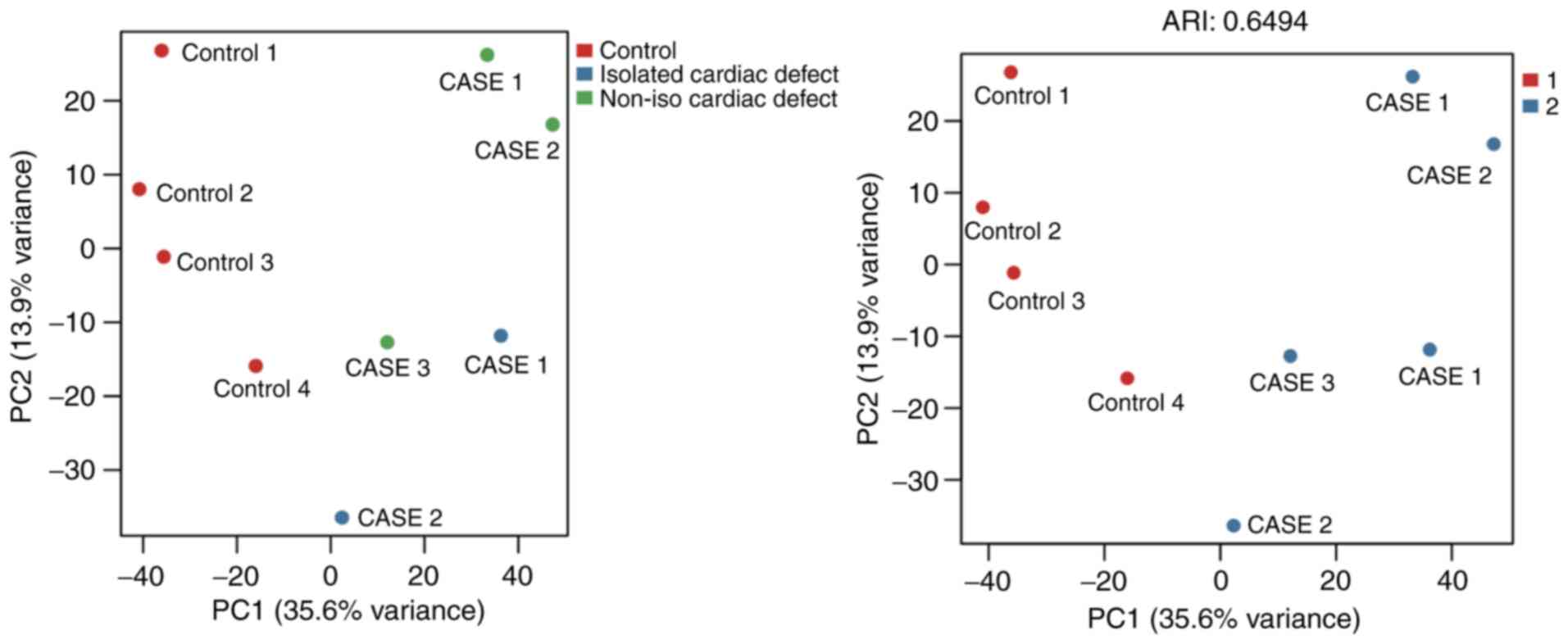 A total of 17,386 CpG sites located in 1,546 methylated regions were captured through the present methylation microarray data analysis. The microarray data have been deposited in the figshare database (DOI: https://doi.org/10.6084/m9.figshare.14130173). The results revealed more hypomethylated regions than hypermethylated regions in both isolated and non-isolated cardiac defect cases compared with the normal controls. In isolated cardiac defect cases, 835 DMRs were tested (Table SVII), of which over 68% (569 DMRs) were hypomethylated (Fig. 1). In non-isolated cardiac defects, 711 DMRs were tested (Table SVIII), of which up to 84% (604 DMRs) were hypomethylated (Fig. 1). After combining isolated and non-isolated cardiac defect cases, the results identified global hypomethylation alteration, at a genome-wide level, with 1,186 DMRs (Table SIX), of which 1,052 (89%) were hypomethylated compared with those in control samples (Fig. 1). Additionally, the present study conducted a principal component analysis based on the most variable levels of 1,737 CpG methylation, which showed that cardiac defect cases were clearly clustered from the normal controls, but the subgroups of cardiac defects with and without extracardiac defects did not appear to differentiate from each other very well (Fig. 2). Therefore, the isolated cardiac defect and the non-isolated cases were combined to form the full set of cardiac defects in subsequent analyses.