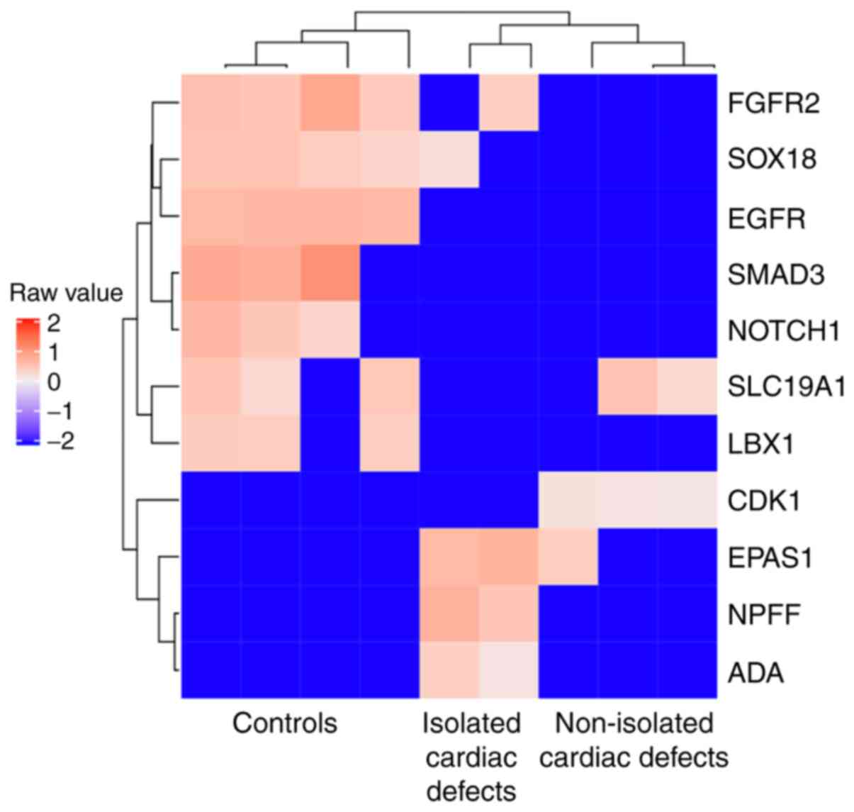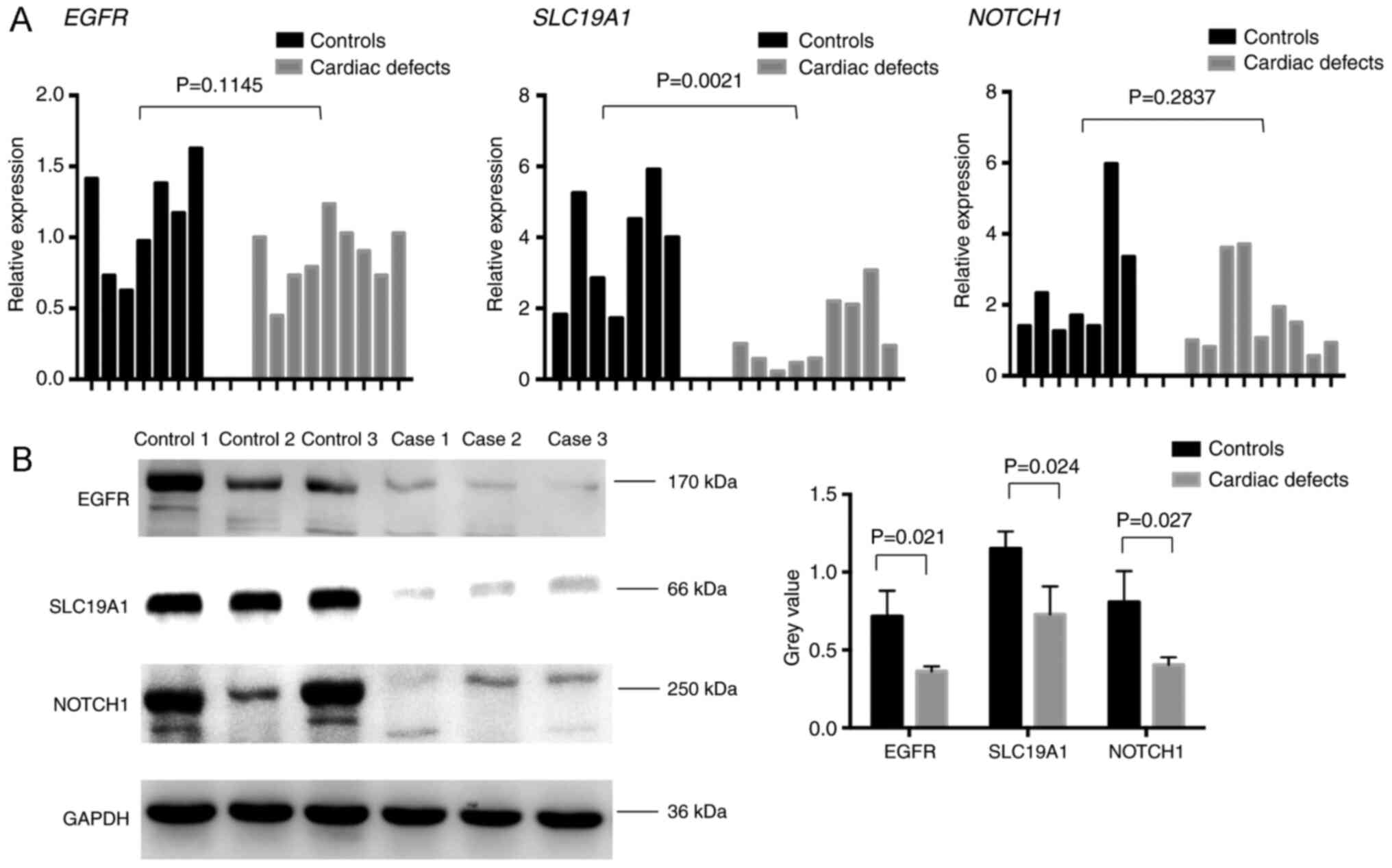 Heart tissues from fetuses with and without cardiac defects were homogenized in RIPA lysis buffer (Beyotime Institute of Biotechnology), using an electric homogenizer to break tissue until there was no visible tissue block. Samples were kept on ice for 20 min to fully lyse the tissues. The lysate was ultracentrifuged at 12,000 x g (20 min, 4˚C) to obtain the supernatant for determination of protein concentration using the BCA method. The protein from each sample was treated with 5X loading buffer, and the concentration was then adjusted to 1 µg/µl by supplementing the remaining volume with protein lysate as diluent. Finally, the protein sample was denatured in a 100˚C water bath for 5 min and loaded onto a gel or stored at -80˚C for later use. For each sample, the proteins in 20 µl were separated by 10% SDS-PAGE and transferred to a nitrocellulose membrane. The membranes were blocked with 5% non-fat milk powder for 2 h at room temperature in TBS with 0.05% Tween-20 (TBST) and incubated with primary antibodies overnight at 4˚C. Primary antibodies used were rabbit polyclonal EGFR antibody (1:1,000; cat. no. sc-03; Santa Cruz Biotechnology, Inc.), rabbit polyclonal SLC19A1 antibody (1:1,000; cat. no. ab62302; Abcam), rabbit polyclonal NOTCH1 antibody (1:1,000; cat. no. ab27526; Abcam), and rabbit polyclonal GAPDH antibody (1:2,500; cat. no. ab263962 Abcam) as a control. The blots were rinsed in TBST three times and incubated in HRP-conjugated secondary antibody (1:5,000; cat. no. ab6721; Abcam) for 1 h at room temperature. Immunoreactive proteins were developed in ECL Plus and were exposed using the LAS-3000 system (Fujifilm Wako Pure Chemical Corporation). The densitometry of the bands was calculated using ImageJ (version 1.8.0, National Institutes of Health).