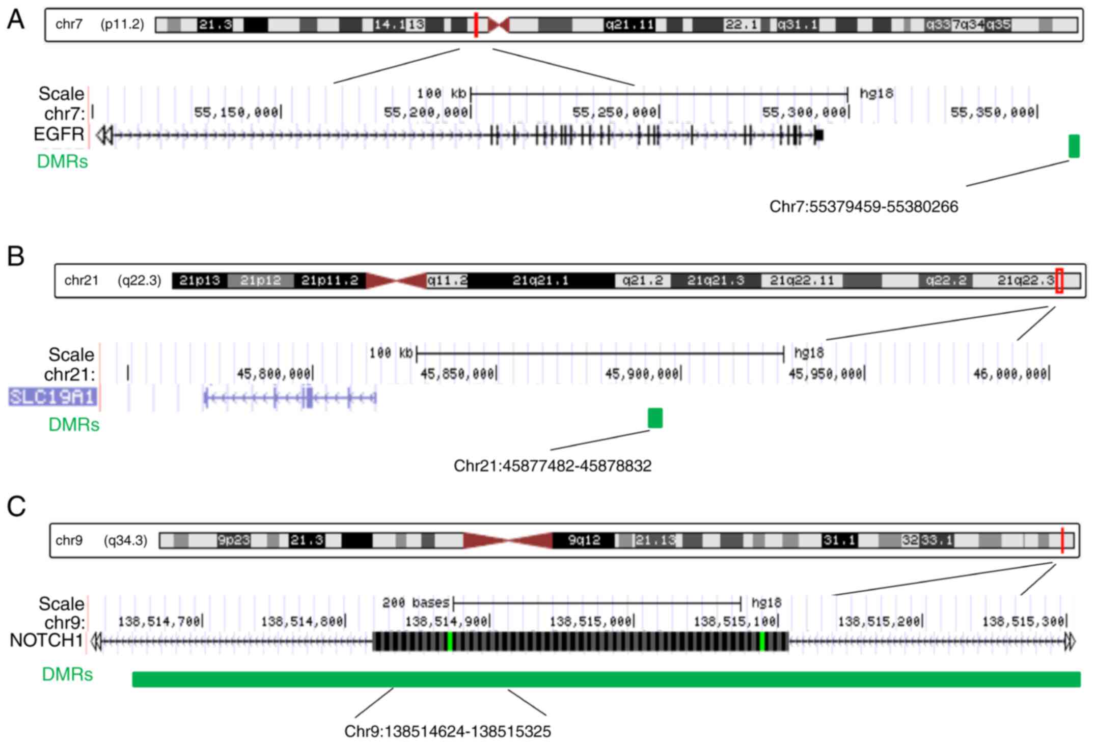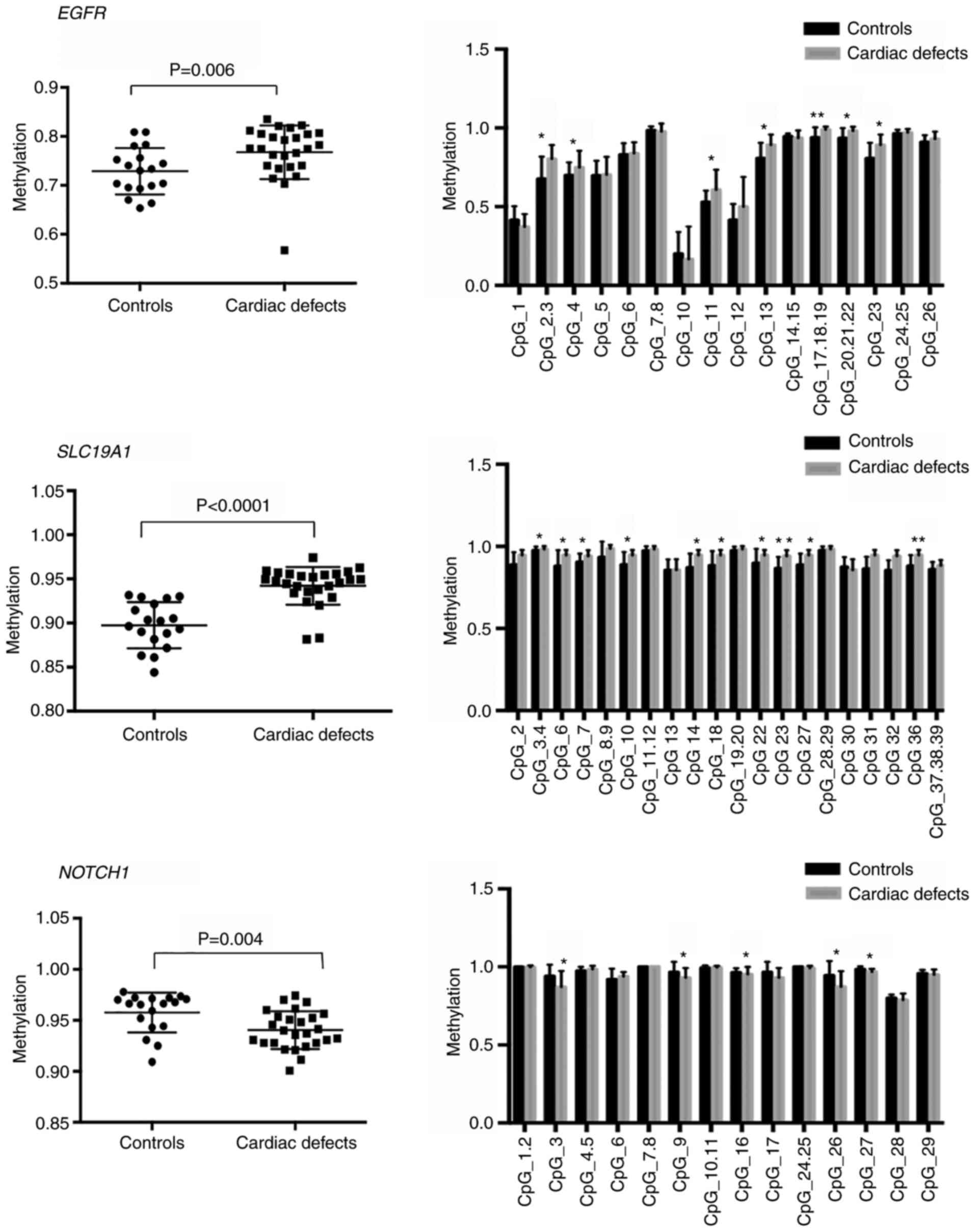 There are several limitations in the present study. Firstly, the number of cases for some cardiac defect subtypes was small. Secondly, the present study did not use multiple methods to validate the methylation microarray data, because of undetectable methylation level of some CpG sites by EpiTYPER analysis and certain methodological limitations. Thirdly, some interfering factors, including fetal chromosomal abnormalities, the overlap between CpG sites and single-nucleotide polymorphisms and adverse maternal exposure, should also be considered and excluded. Fourthly, subsequent studies are required to clarify the relationship between gene expression and CpG site-specific methylation levels at specific areas and at CpG sites other than those near the EGFR, SLC19A1, and NOTCH1 promoters.