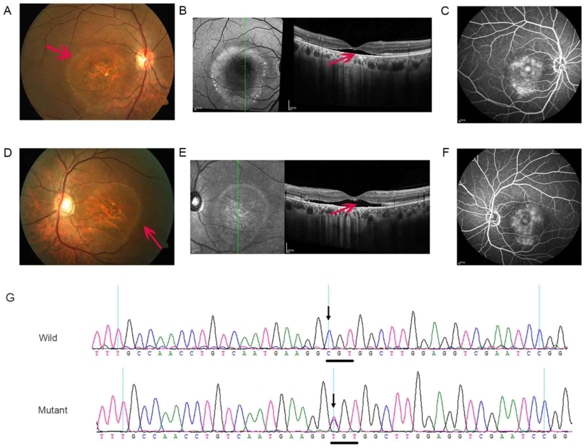 All patients were from southern China. A 62-year-old female patient (Patient no. 1; Fig. 1) had no known familial history of ocular diseases. Her best-corrected visual acuity (BCVA) was 20/100 in both eyes, which was not possible to be corrected. The cornea was transparent and there were certain opacities in the lens. Fundus examination indicated that certain pigments in the macular area and the fovea reflex were negative (Fig. 1A and D) compared to anormal control subject (Fig. 1H). OCT scans revealed that the foveal region was abnormally thick in both eyes due to neuroretinal detachment from the retinal pigment epithelium (RPE; Fig. 1B and E), which was likely triggered by the abnormal accumulation of subretinal fluid compared to the normal control (Fig. 1I). FFA indicated pooling of fluorescein dye in the cystoid spaces in the late phase of fluorescein angiography, which may have been caused by the RPE defect (Fig. 1C and F). The Arden ratio (light peak/dark trough) was markedly reduced to <1.6. Chronic central serous chorioretinopathy (CSC) was initially diagnosed and the patient was treated with photodynamic therapy (PDT) with no clinical response.