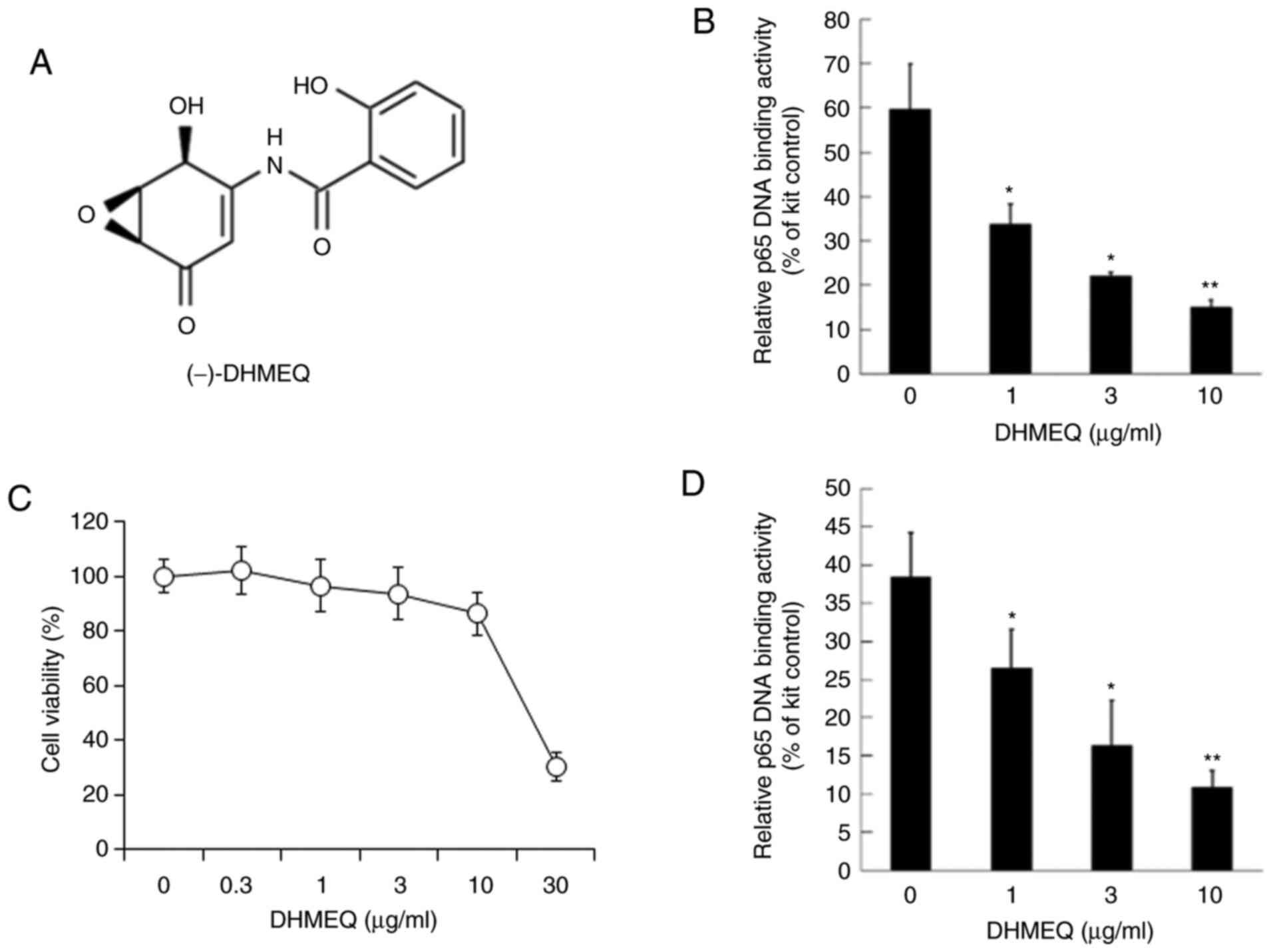 The nuclear fraction of SP2/0 cells was used for NF-κB, including p65. The in vitro binding of p65 and κB sequence DNA was inhibited by DHMEQ (Fig. 1A) at 1-10 µg/ml, as shown in Fig. 1B. Next, the effect on viability was studied. DHMEQ did not show prominent cytotoxicity below 10 µg/ml in 24 h, as shown in Fig. 1C. Then, DHMEQ was added to the cultured SP2/0 cells for 2 h. DHMEQ at 1-10 µg/ml inhibited the NF-κB activity in cultured SP2/0 cells (Fig. 1D).