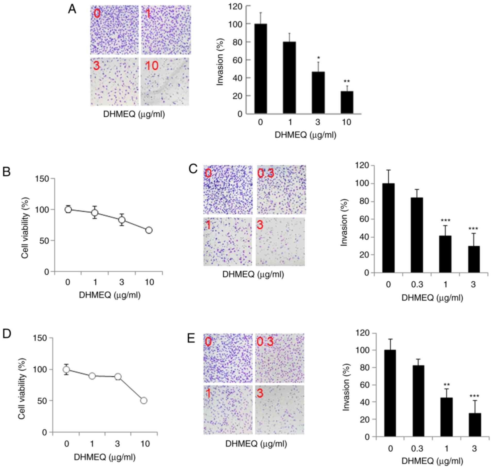 The cells were harvested and washed with PBS. After washing, 3x105 cells were resuspended in 500 µl serum-free medium and treated with different concentrations of DHMEQ. Cells were then transferred to the top of Matrigel-coated invasion chambers (24-well insert; Corning Inc.), and 750 µl of 20% FBS-RPMI-1640 was added to the bottom chamber. After 24 h of incubation, the non-invading cells were removed, and the invading cells that were attached to the bottom were fixed with methanol for 10 min and stained with Diff-Quick solution (Sysmex). Invading cells were photographed under the microscope at x10 magnification and counted.