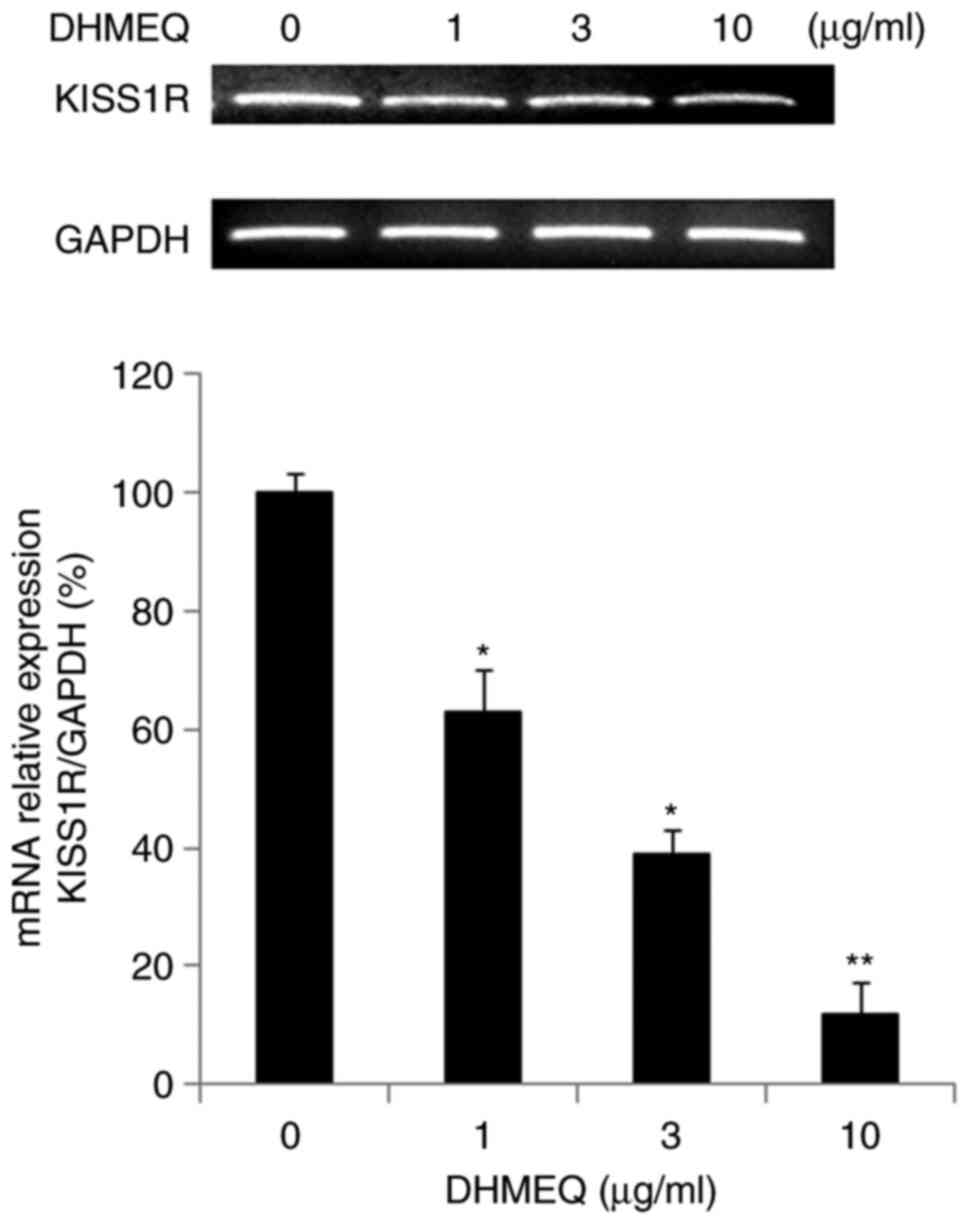 We employed a mouse metastasis PCR array to study the mechanism of inhibition by DHMEQ. The results of the PCR array are shown in Table SI. Several gene expressions were activated or inhibited by DHMEQ. Among them, we selected KISS1R for further study because its function in cancer progression is not fully understood. We confirmed the effect of DHMEQ on KISS1R expression by independent PCR. DHMEQ inhibited the KISS1R expression as shown in Fig. 3.