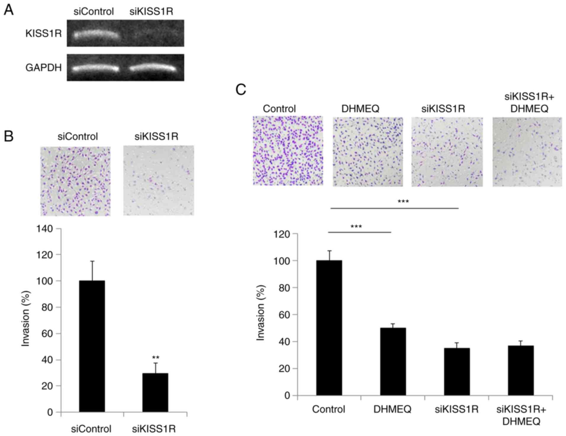siKISS1R (sc-60748), and control siRNA (sc-37007) were purchased from Santa Cruz Biotechnology Inc. siKISS1R knockdown was performed using Lipofectamine® RNAiMax transfection reagent (Thermo Fisher Scientific, Inc.) according to the manufacturer's instructions. The efficiency of transfection was determined by mRNA expression.