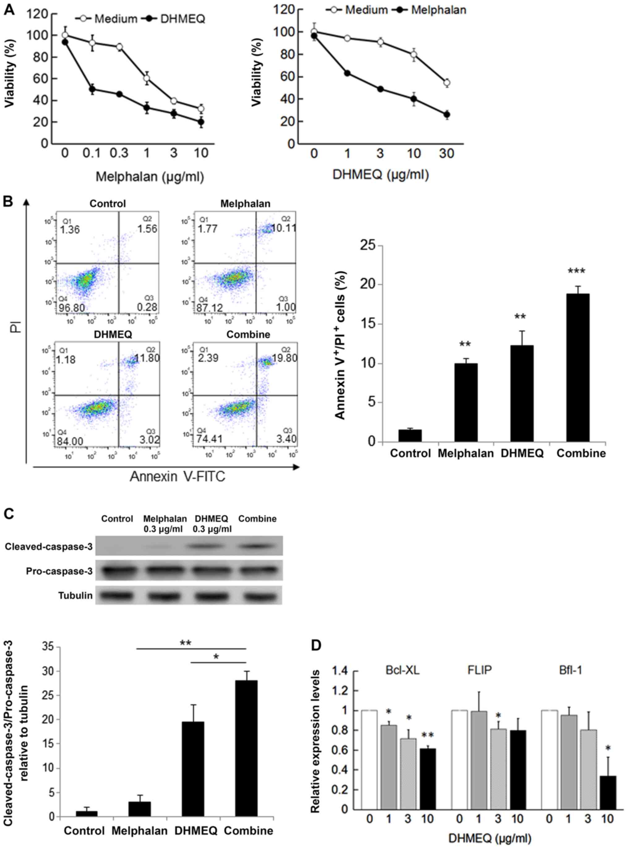 Cell viability was evaluated by the MTT assay. Cell suspensions at a density of 3x105 cells per ml were seeded in a 96-well plate. The next day, cells were treated with the desired concentrations of DHMEQ for 24 h, and at each end-point 2 µl MTT was added to each well and incubated for additional 1 h. For the combined activity study, cells were treated with DHMEQ for 30 min, then melphalan was added at the indicated concentrations and incubated at the indicated times. After incubation, MTT reagent was added to each well and incubated for 1 h. Absorbance was measured at 570 nm with a microplate reader. Cell viability was expressed as a percentage of the control samples.