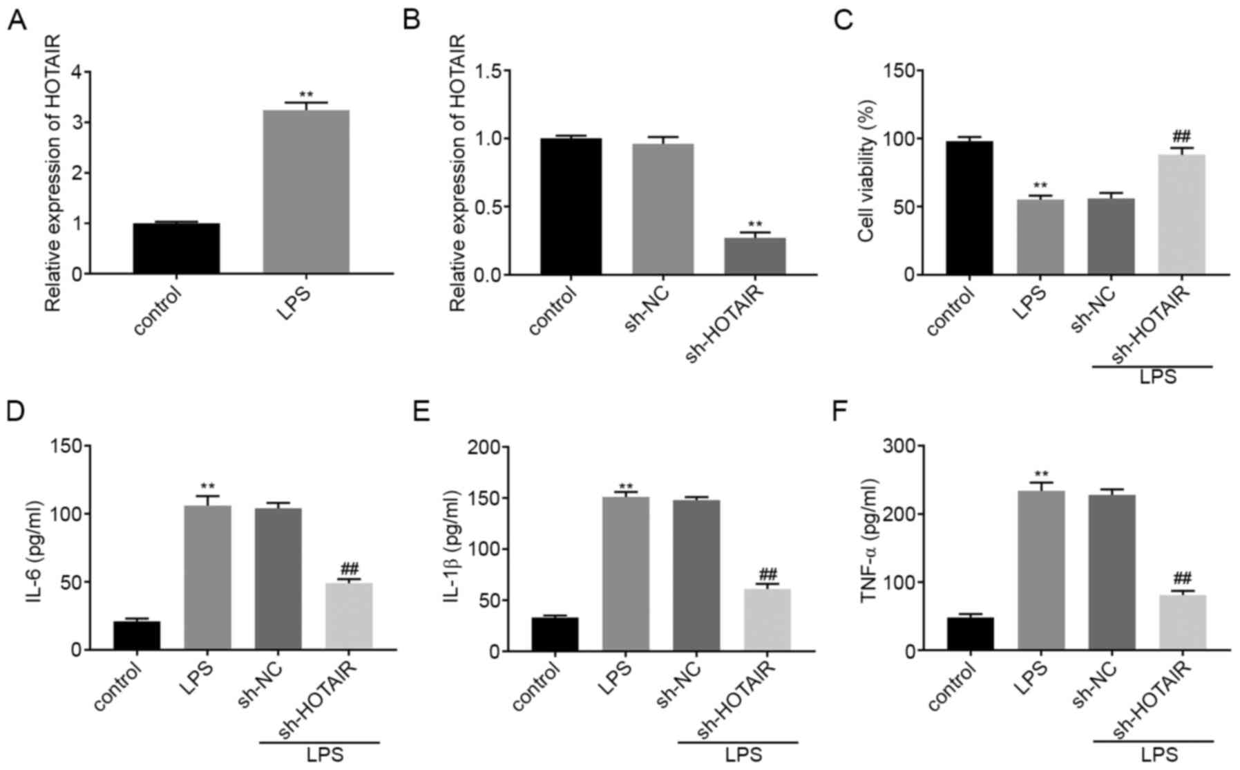 HOTAIR mRNA expression level was upregulated in the MLE-12 cells in the LPS group compared with that in the control group (P<0.01; Fig. 1A). RT-qPCR was then used to determine the transfection efficiency of sh-HOTAIR and sh-NC in the MLE-12 cells and the results illustrated that HOTAIR expression was significantly decreased in the sh-HOTAIR group compared with that in the sh-NC group (P<0.01; Fig. 1B). A MTT assay revealed that, compared with that in the control cells, treatment with LPS significantly decreased cell viability. Cell viability in the sh-HOTAIR + LPS group was also significantly increased compared with that in the sh-NC + LPS group (P<0.01; Fig. 1C). ELISA results showed that the concentration of IL-6, IL-1β and TNF-α were all upregulated in the MLE-12 cells in the LPS group compared with that in the control group. However, transfection with sh-HOTAIR significantly decreased the concentration of the inflammatory factors in the MLE-12 cells treated with LPS compared with that in cells transfected with sh-NC (P<0.01; Fig. 1D-F).