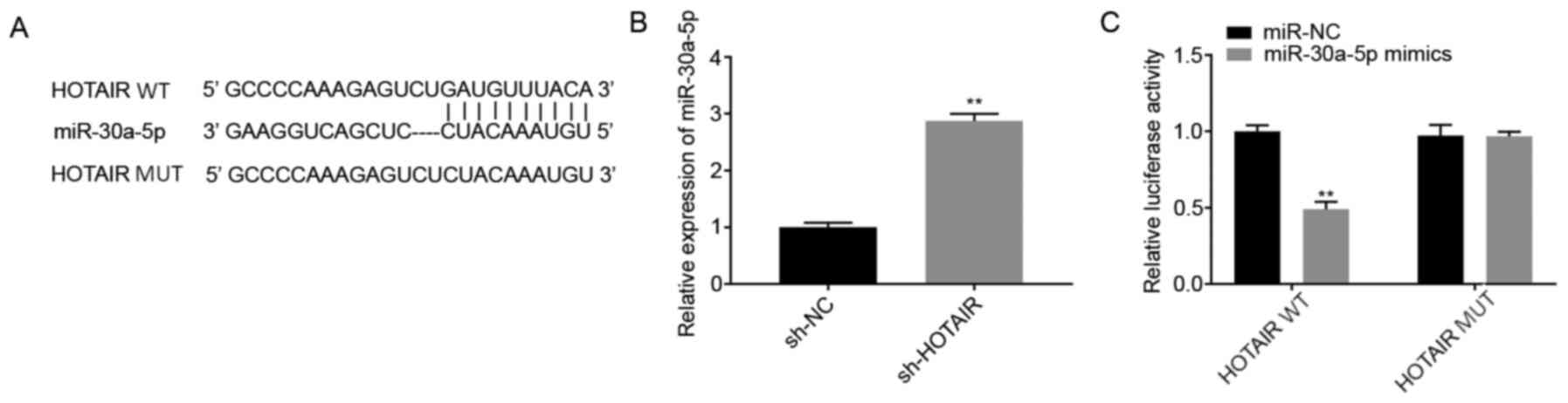 The miRNA targets of HOTAIR were predicted using StarBase database (http://starbase.sysu.edu.cn/). In addition, the mRNA targets of miR-30a-5p were predicted using TargetScan database (http://www.targetscan.org).