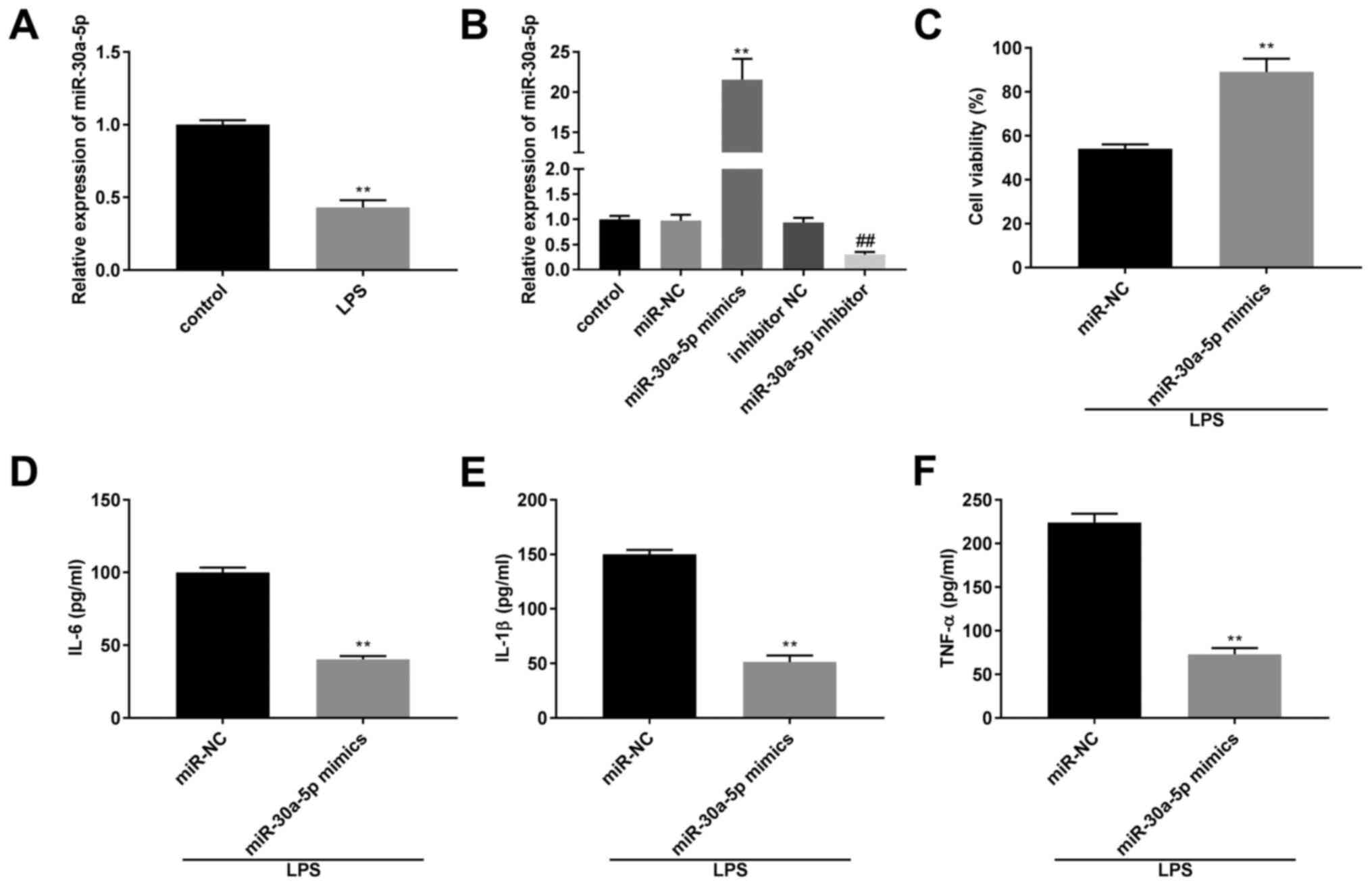 The mRNA expression level of miR-30a-5p was significantly lower in the LPS group compared with that in the control group (P<0.01; Fig. 3A). The transfection efficiency of the miR-30a-50p mimics, inhibitor and their respective NCs in the MLE-12 cells was determined using RT-qPCR. The results revealed that miR-30a-5p mRNA expression levels were downregulated by the miR-30a-5p inhibitor and upregulated by miR-30a-5p mimics (P<0.01; Fig. 3B). After treatment with LPS, the results from a MTT assay and ELISA demonstrated that compared with that in the miR-NC group, cell viability and the concentration of IL-6, IL-1β and TNF-α was increased and decreased, respectively, in the miR-30a-5p mimics group (P<0.01; Fig. 3C-F).