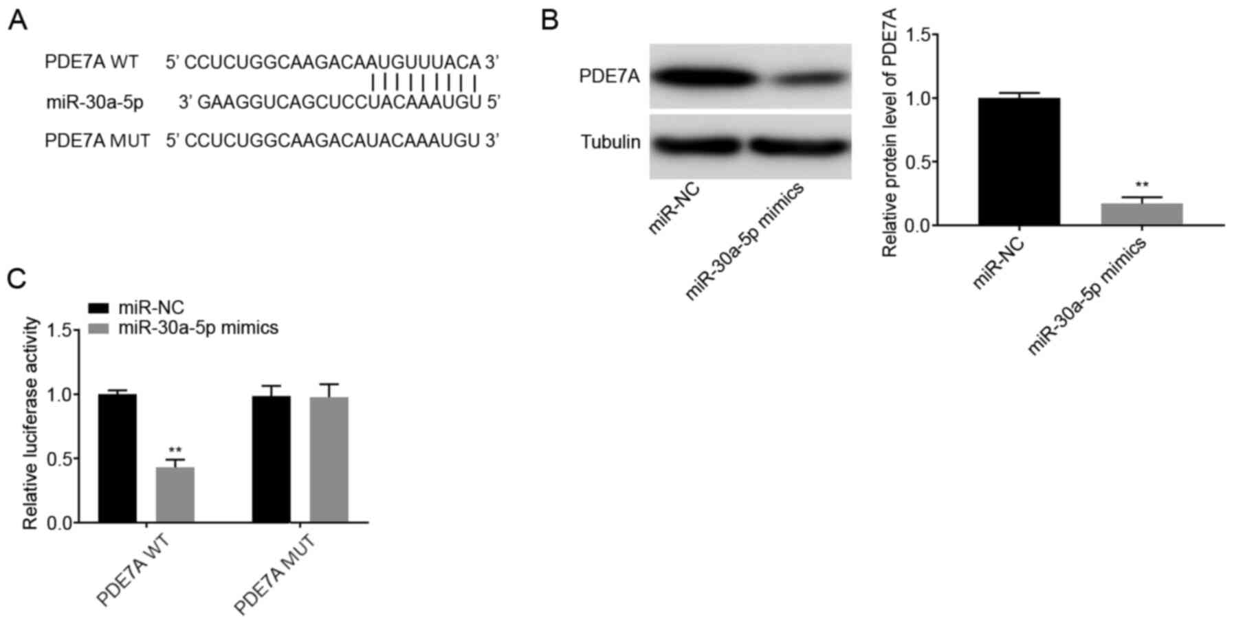 Using TargetScan database, the potential binding site between miR-30a-5p and PDE7A was predicted (Fig. 4A). A total of 1,570 targets were predicted. PDE7A was selected for further analysis as it has been associated with pulmonary inflammatory diseases, such as chronic obstructive pulmonary disease and asthma (24). Western blot analysis showed that the protein expression levels of PDE7A were decreased in the miR-30a-5p mimics group compared with that in the miR-NC group (P<0.01; Fig. 4B). DLR assays showed that luciferase activity was lower in the PDE7A WT + miR-30a-5p mimics group compared with that in the PDE7A WT + miR-NC group (P<0.01; Fig. 4C).