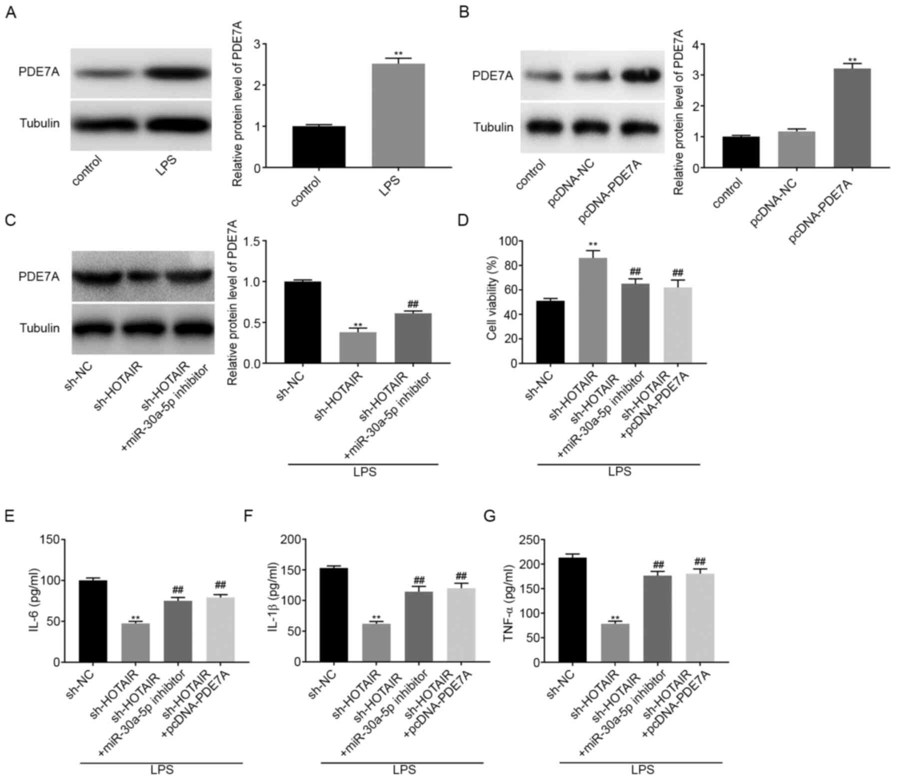 Western blot analysis was used to determine the protein expression levels of PDE7A in LPS-induced MLE-12 cells. The results showed that LPS treatment significantly increased PDE7A protein expression levels (P<0.01; Fig. 5A). pcDNA-PDE7A or pcDNA-NC were then transfected into the MLE-12 cells and the results from western blot analysis demonstrated that PDE7A overexpression significantly increased the protein expression levels of PDE7A (P<0.01; Fig. 5B). Subsequently, sh-NC, sh-HOTAIR, or sh-HOTAIR + miR-30a-5p inhibitor was transfected into the MLE-12 cells, then stimulated with LPS. The protein expression level of PDE7A was subsequently analyzed and the results indicated that HOTAIR knockdown decreased the protein expression level of PDE7A, whereas downregulation of miR-30-5p reversed the inhibitory effect of HOTAIR knockdown on PDE7A protein expression levels (P<0.01; Fig. 5C). The results from the MTT assay showed that cell viability increased in the sh-HOTAIR group compared with that in the sh-NC group, whereas cell viability in both the sh-HOTAIR + miR-30a-5p inhibitor group and the sh HOTAIR + pcDNA-PDE7A group was partly reduced compared with that in the sh-HOTAIR group (P<0.01; Fig. 5D). ELISA results showed that the concentrations of IL-6, IL-1β, and TNF-α were all decreased by HOTAIR knockdown. However, downregulation of miR-30a-5p and upregulation of PDE7A both reversed the suppressive effect of HOTAIR knockdown on the concentration of the inflammatory factors (P<0.01; Fig. 5E-G).