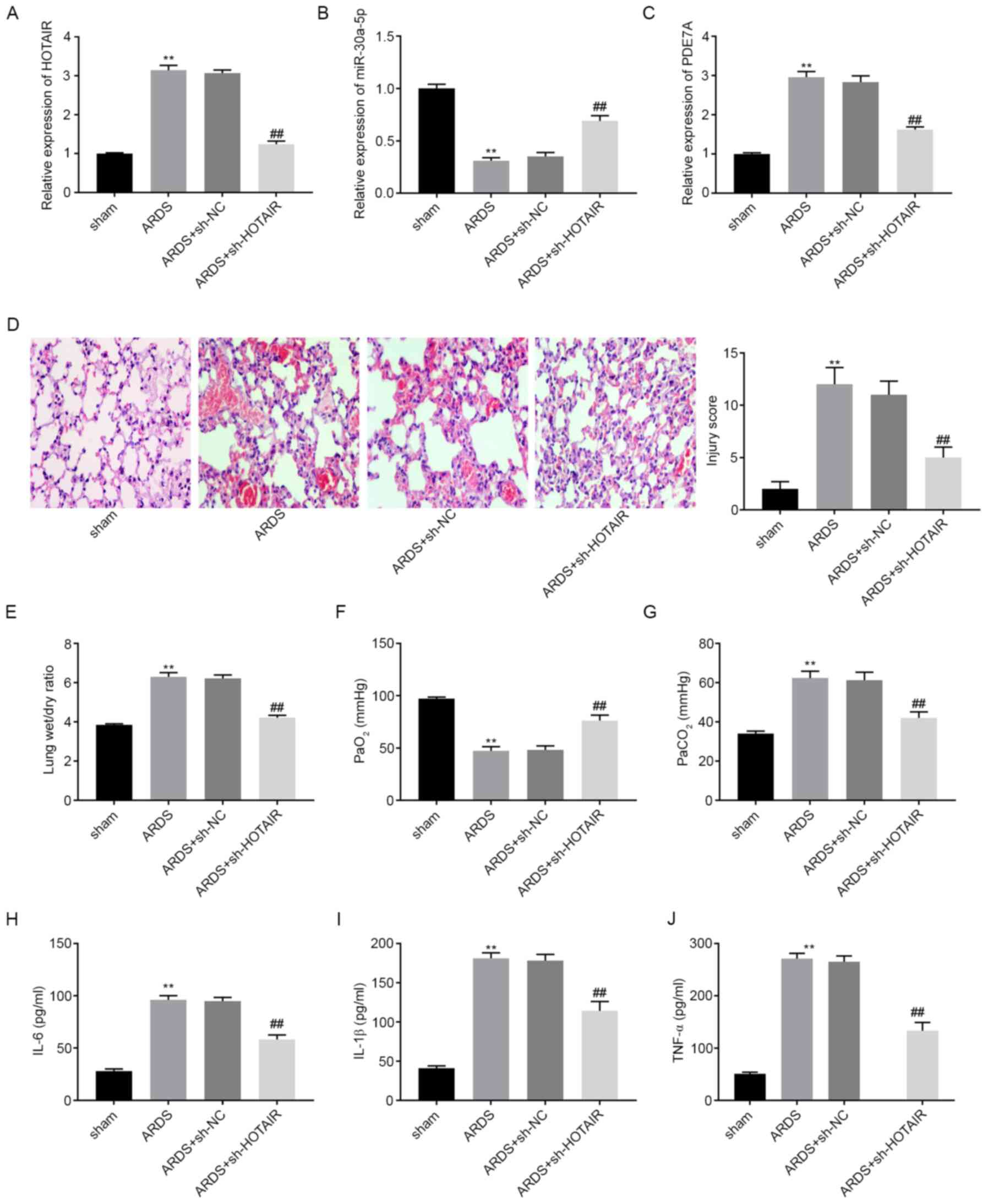 In the present study the effects of lncRNA HOTAIR knockdown on the concentrations of inflammatory factors in MLE-12 cells, the regulatory mechanism of how HOTAIR regulates the miR-30a-5p/PDE7A axis in LPS-induced MLE-12 cells and the effect of HOTAIR knockdown on LPS-induced ARDS in vivo were investigated. The results are aimed to provide a promising therapeutic target for ARDS.