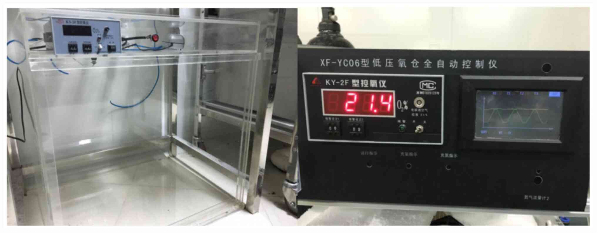 The PAH rat model was established with a single iH administration of monocrotaline (MCT; cat. no. IC0930; Beijing Solarbio Science & Technology, Co., Ltd.) and continuous hypoxia treatment (37). The rats were then treated with saline, DIZE or DX-600 before beign returned into the hypoxic chamber. The daily injection time was from 8:00 to 8:30 am in the morning, during which time the rats were in a normoxic room. During the 28 days of hypoxia, drug administration was only performed for the first 21 days i.e on day 21 of modeling, the rats were injected with saline, DIZE or DX-600 for the final time. No drugs were injected during the last 7 days of modeling. The successful establishment of modeling was determined by measuring rat weight, right ventricular systolic pressure (RVSP), right ventricular hypertrophy index (RVHI) and observing pathological changes (38). The rats in the PAH group were fed in a special KY-2F hypoxic tank (Fig. 1; Jiande Meicheng Analysis Instrument Factory), whilst rats in the normoxic group were fed in a normal oxygen environment. The KY-2F oxygen controller monitored the oxygen concentration in real time.