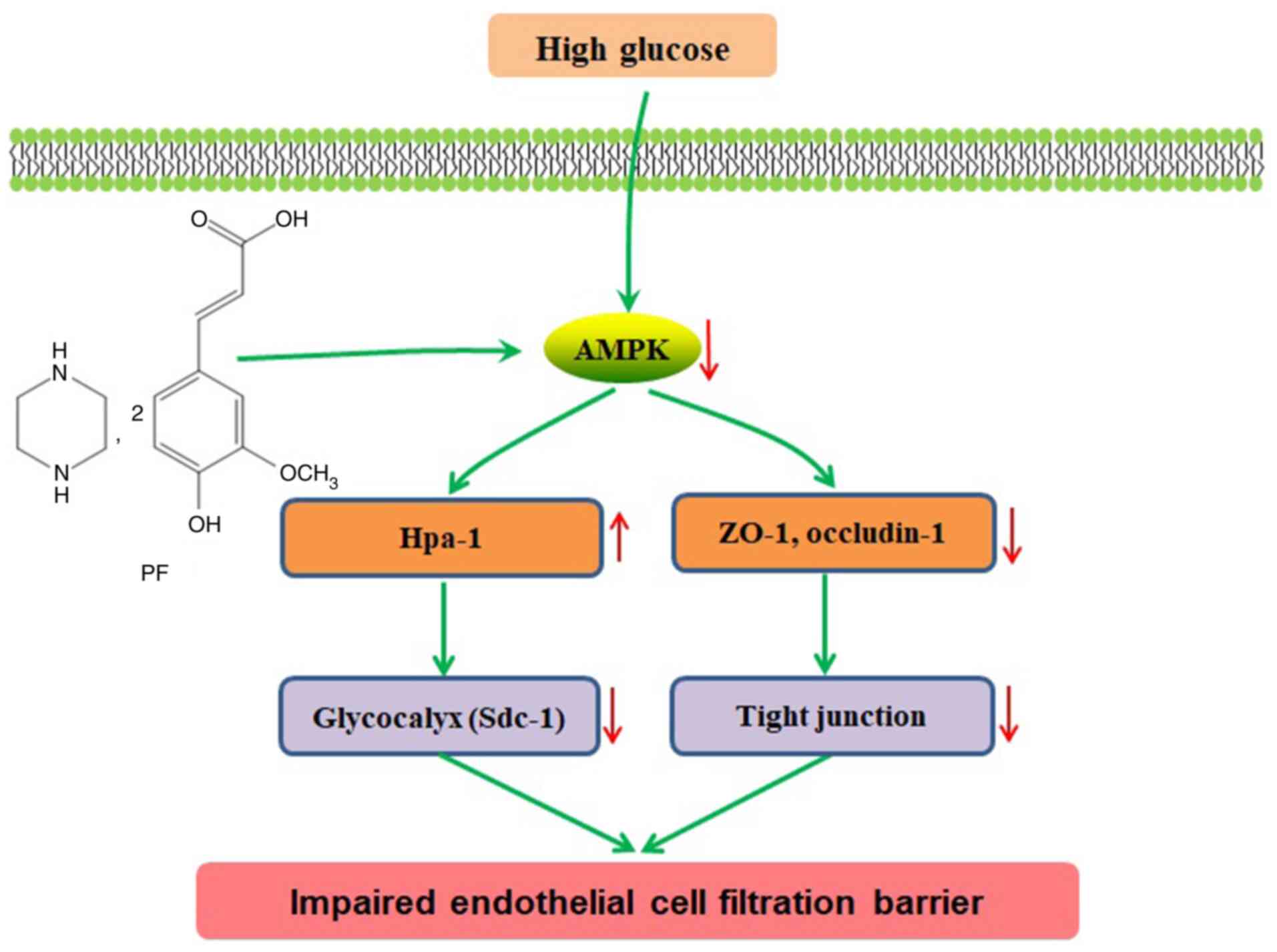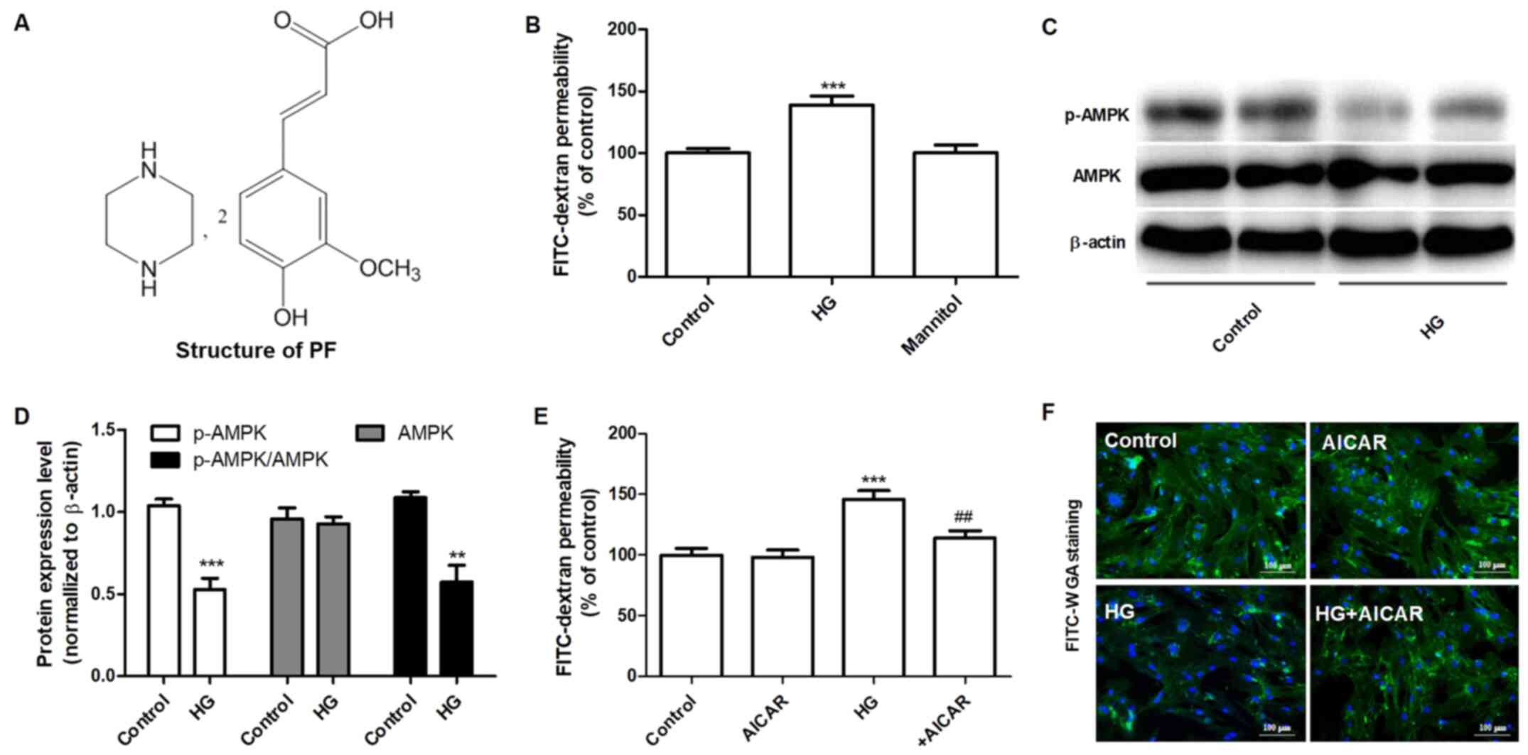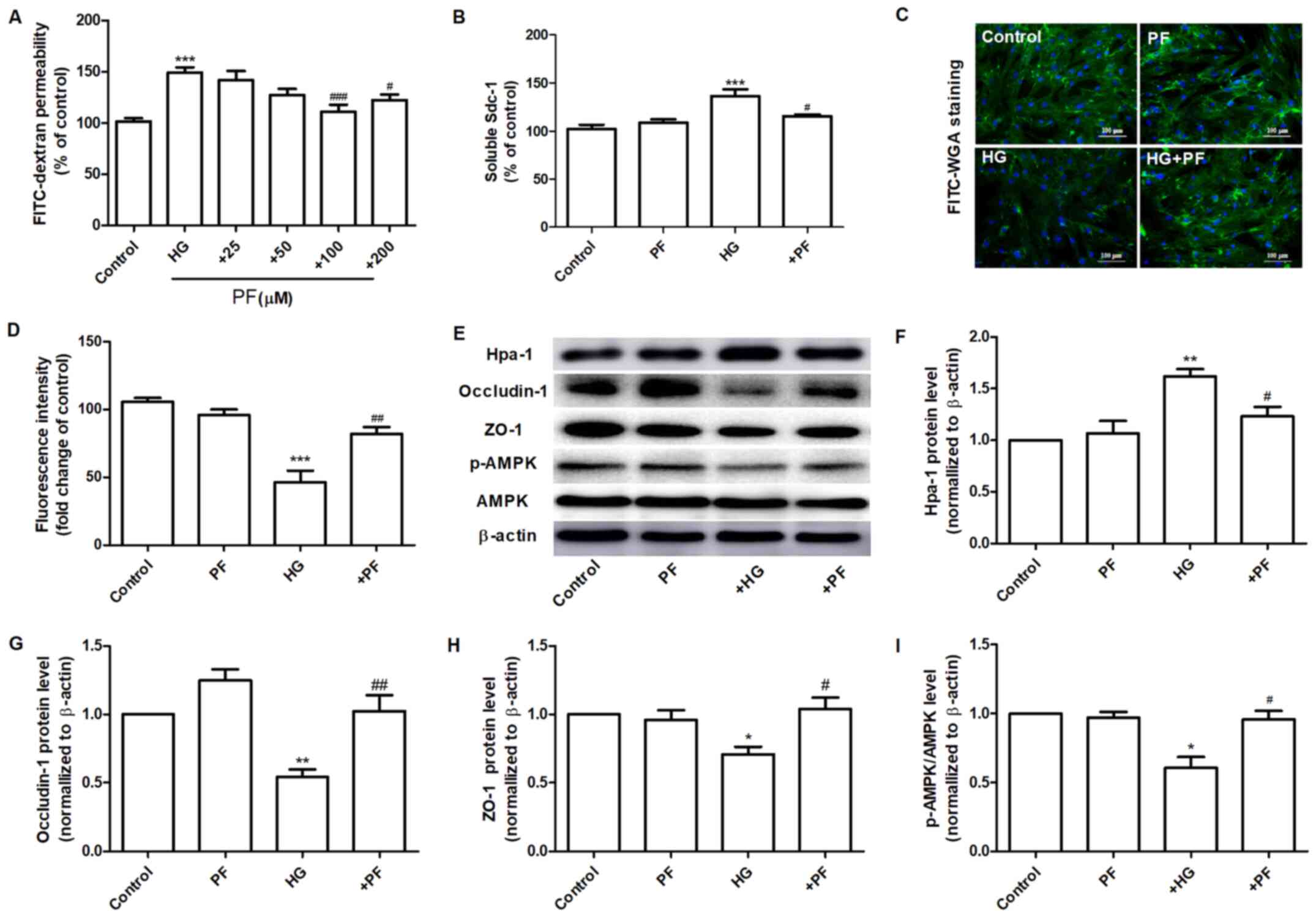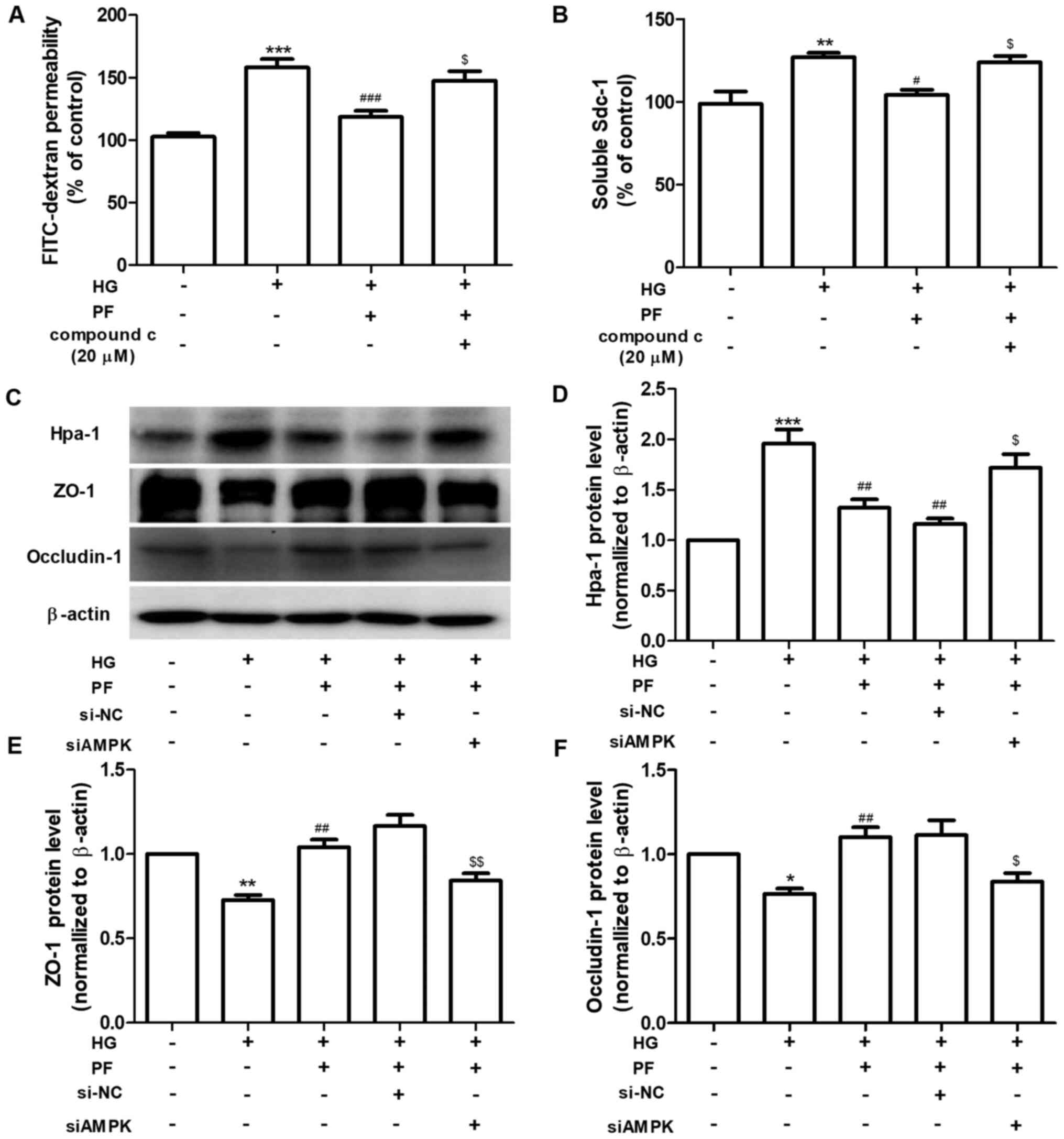 PF was provided by Hunan QianJinXiangJiang Pharmaceutical Industry Co., Ltd. Fluorescein isothiocyanate (FITC)-dextran and FITC conjugated wheat germ agglutinin (FITC-WGA) were obtained from Sigma-Aldrich (Merck KGaA). Rabbit polyclonal anti-occludin-1 (cat. no. DF7504) and anti-heparanase (Hpa-1) antibodies (cat. no. DF12411) were purchased from Affinity Biosciences. Rabbit polyclonal anti-AMPK (cat. no. 2532) and anti-phosphorylated (p)-AMPKα (Thr172) antibodies (cat. no. 2535) were obtained from Cell Signaling Technology, Inc. Rabbit polyclonal anti-Zonula occludens-1 (ZO-1; cat. no. PB9234) and mouse monoclonal anti-β-actin antibody (cat. no. BM0627), as well as the syndecan-1 (Sdc-1) ELISA kits (cat. no. EK1339 and EK1554) were purchased from Boster Biological Technology, Ltd. SYBR® Premix Ex Taq™ and PrimeScript reverse transcription reagent kit were obtained from Takara Bio, Inc. TRIzol® was obtained from Thermo Fisher Scientific, Inc. RIPA lysis buffer, 5-aminoimidizole-4-carboxamide riboside (AICAR), the bicinchoninic acid (BCA) assay kit and a BeyoECL Plus kit were obtained from Beyotime Institute of Biotechnology. Glucose and mannitol were purchased from Guoyao Chemical Reagent Co. Compound c was obtained from Selleck Chemicals.