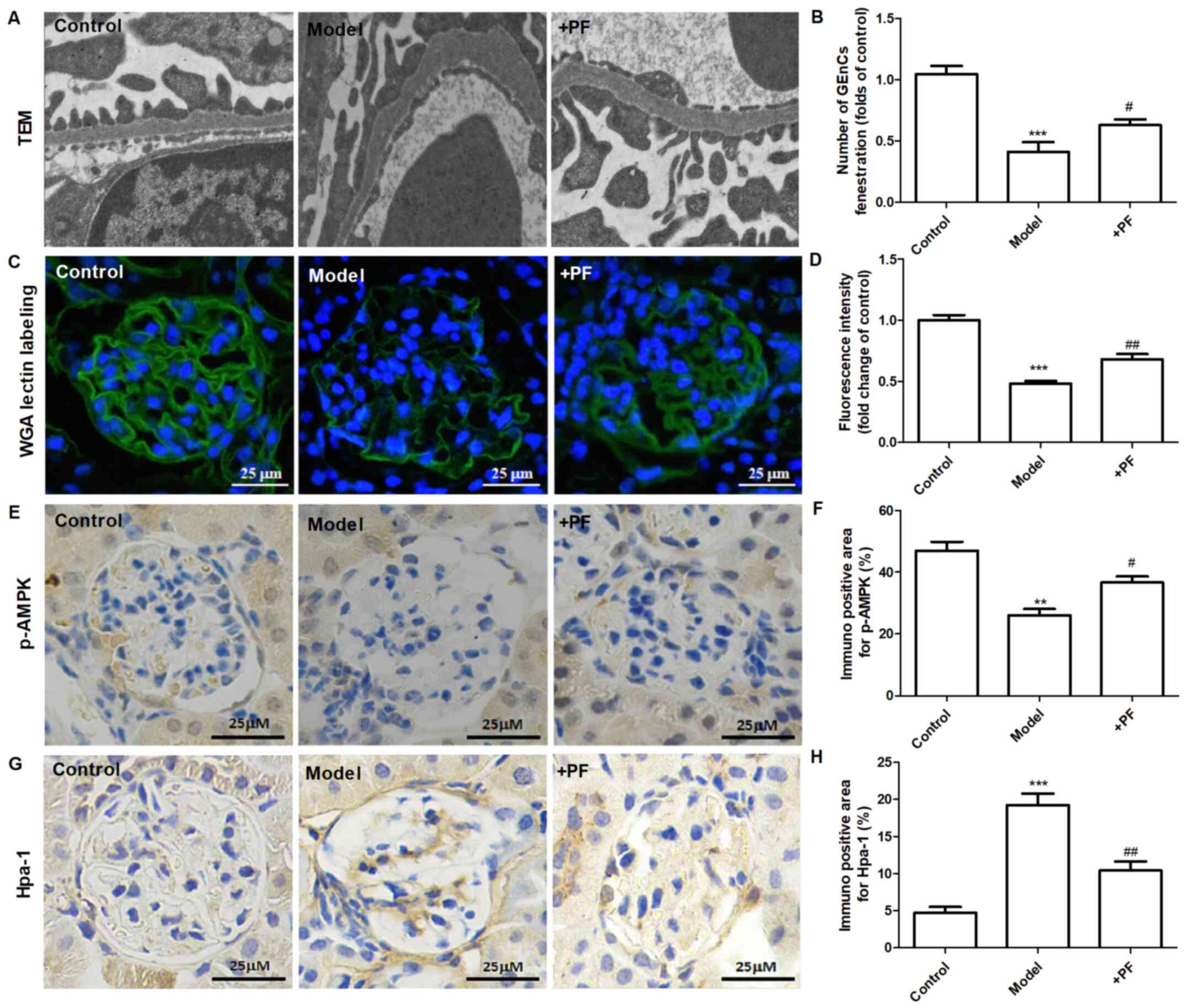 In conclusion, the present study indicated that PF improved filtration barrier injury of GEnCs in a model of early DN, and that this action was mediated by AMPK (Fig. 7). Therefore, restoration of GFB injury via modulation of AMPK activity may serve an alternative approach for future treatment of DN.