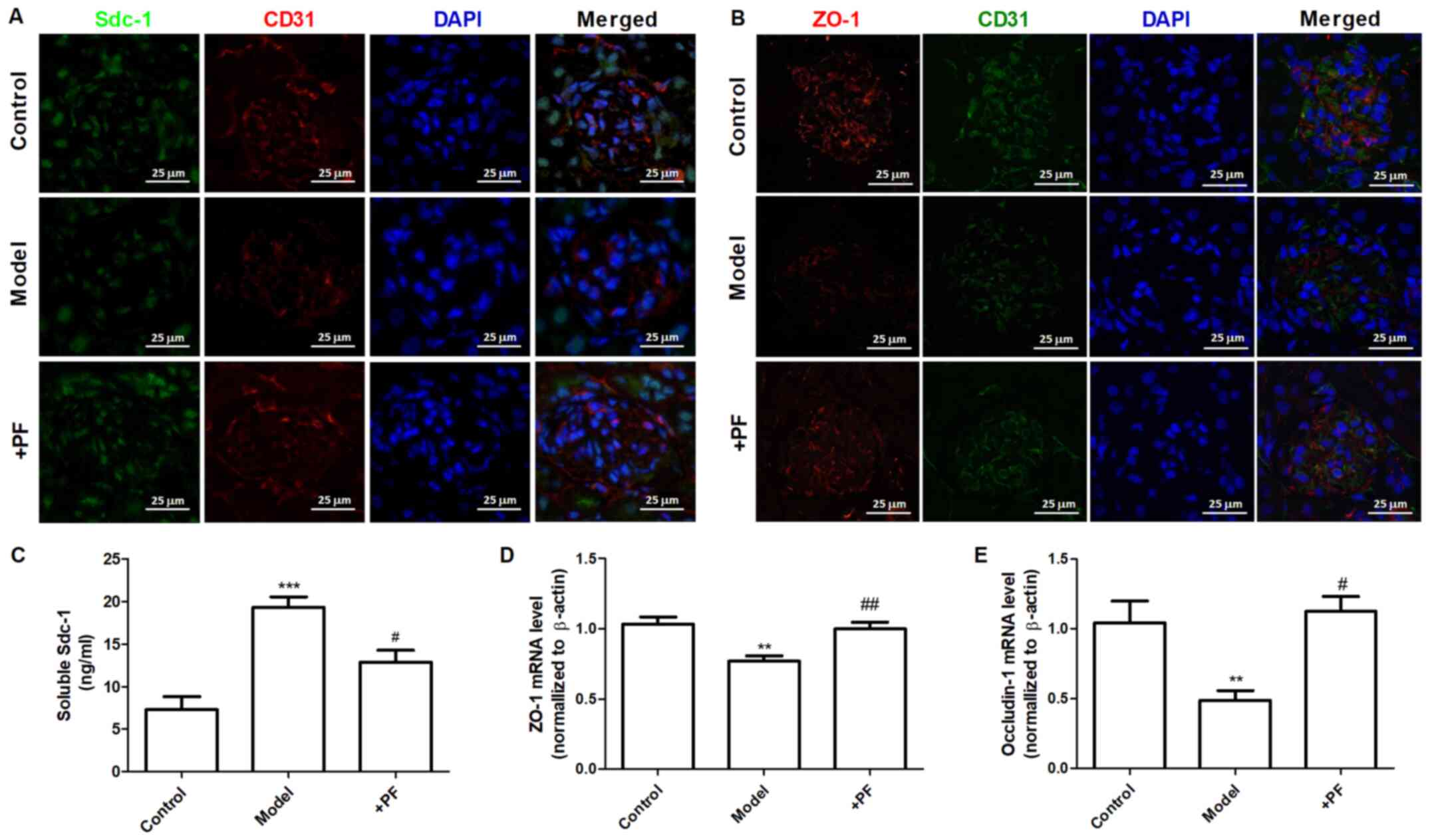 In vitro experiments demonstrated that diabetic mice treated with PF for 12 weeks exhibited an increase in the number of GEnC fenestrations compared with that of the model group (Fig. 5A and B). Immunofluorescence analysis indicated that the glycocalyx content was increased in the glomerular cells of the PF-treated group compared with that of the diabetic mice (Fig. 5C and D). Immunohistochemical analysis indicated that PF significantly increased p-AMPKα (Thr-172) protein expression (Fig. 5E and F) and inhibited the increase in Hpa-1 protein levels in the glomerular cells of diabetic mice (Fig. 5G and H). Immunofluorescence analysis indicated that the expression levels of Sdc-1 (Fig. 6A) and ZO-1 (Fig. 6B) in GEnCs were increased in PF-treated mice compared with those noted in diabetic mice. In addition, treatment of diabetic mice with PF inhibited the increase noted in the expression levels of Sdc-1 in the serum (Fig. 6C). It concomitantly increased the expression levels of ZO-1 and occludin-1 in kidney tissues (Fig. 6D and E). Taken together, these finding indicated that PF reduced GFB damage.