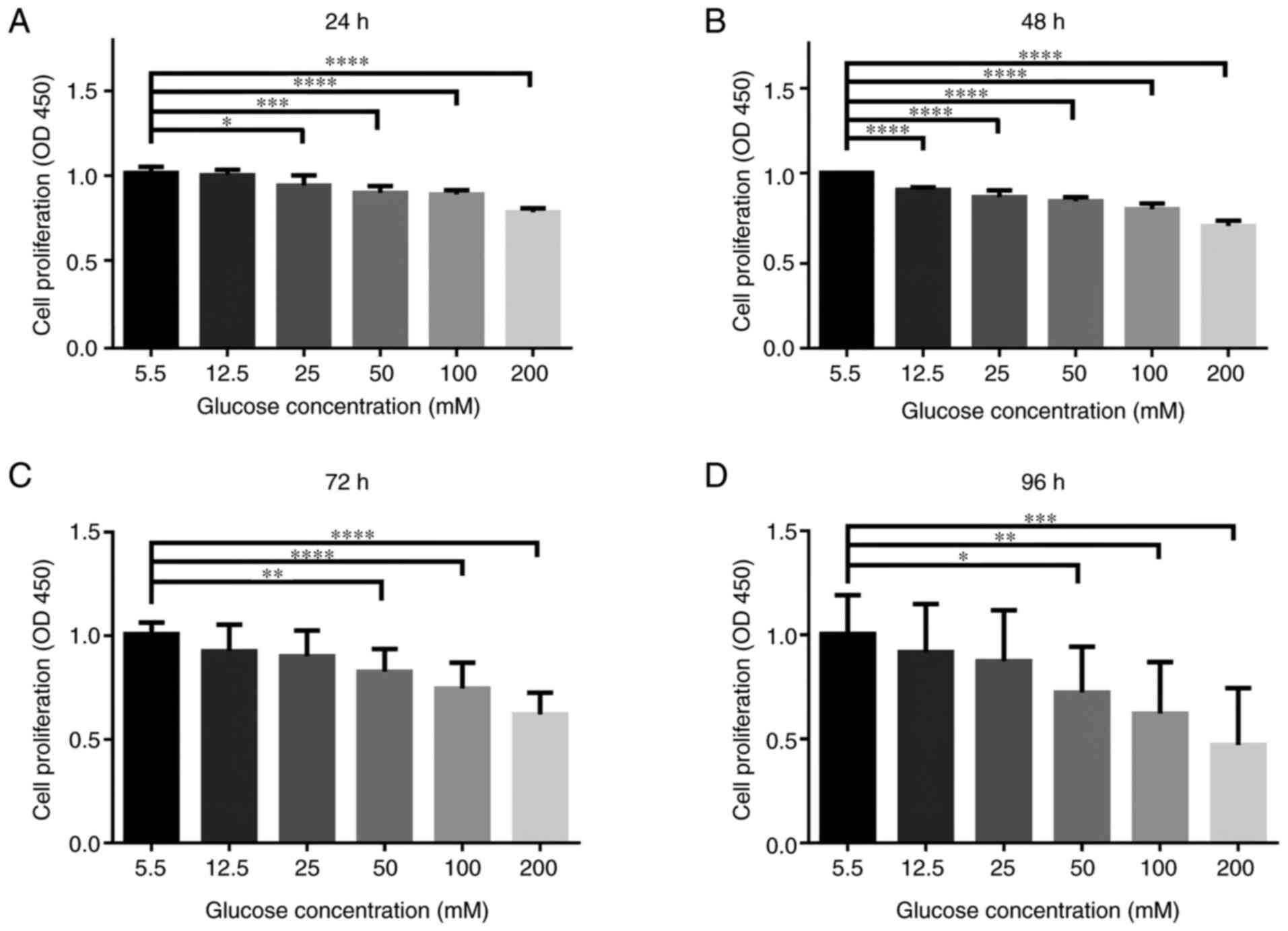 D-glucose was added to the DMEM (low glucose) and then filtered through sterile 0.45-mm PVDF Membrane filter (Merck KGaA) and a stock solution of 500 mM glucose concentration was obtained. Then the stock solution was diluted in complete culture media to obtain the desired concentrations of glucose (5.5, 12.5, 50, 100 and 200 mM). When 50-70% confluence was. reached, NPCs were treated with different doses of glucose at 37˚C for varying amounts of time (24, 48, 72 or 96 h).