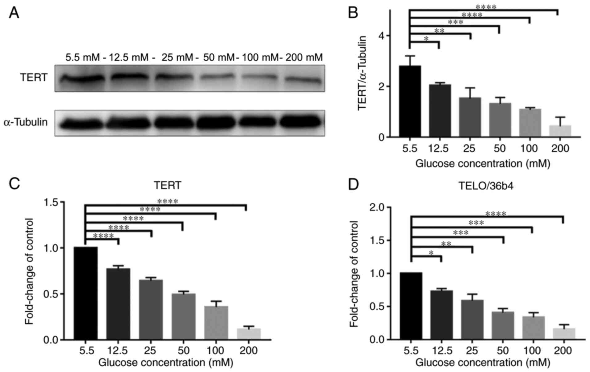 Meanwhile, as presented in Fig. 2C, the expression of mRNA TERT in RT-qPCR was also decreased in a dose-dependent manner (P<0.0001). In addition, as presented in Fig. 2D, the telomere length, detected using the qPCR method by Cawthon (25), also decreased in a dose-dependent manner (P<0.05). Telomere length was observed using qPCR, using the Cawthon method, which is the standard method to check for the telomere length. These results demonstrated that high levels of glucose inhibited the expression of TERT and shortened the telomere length.