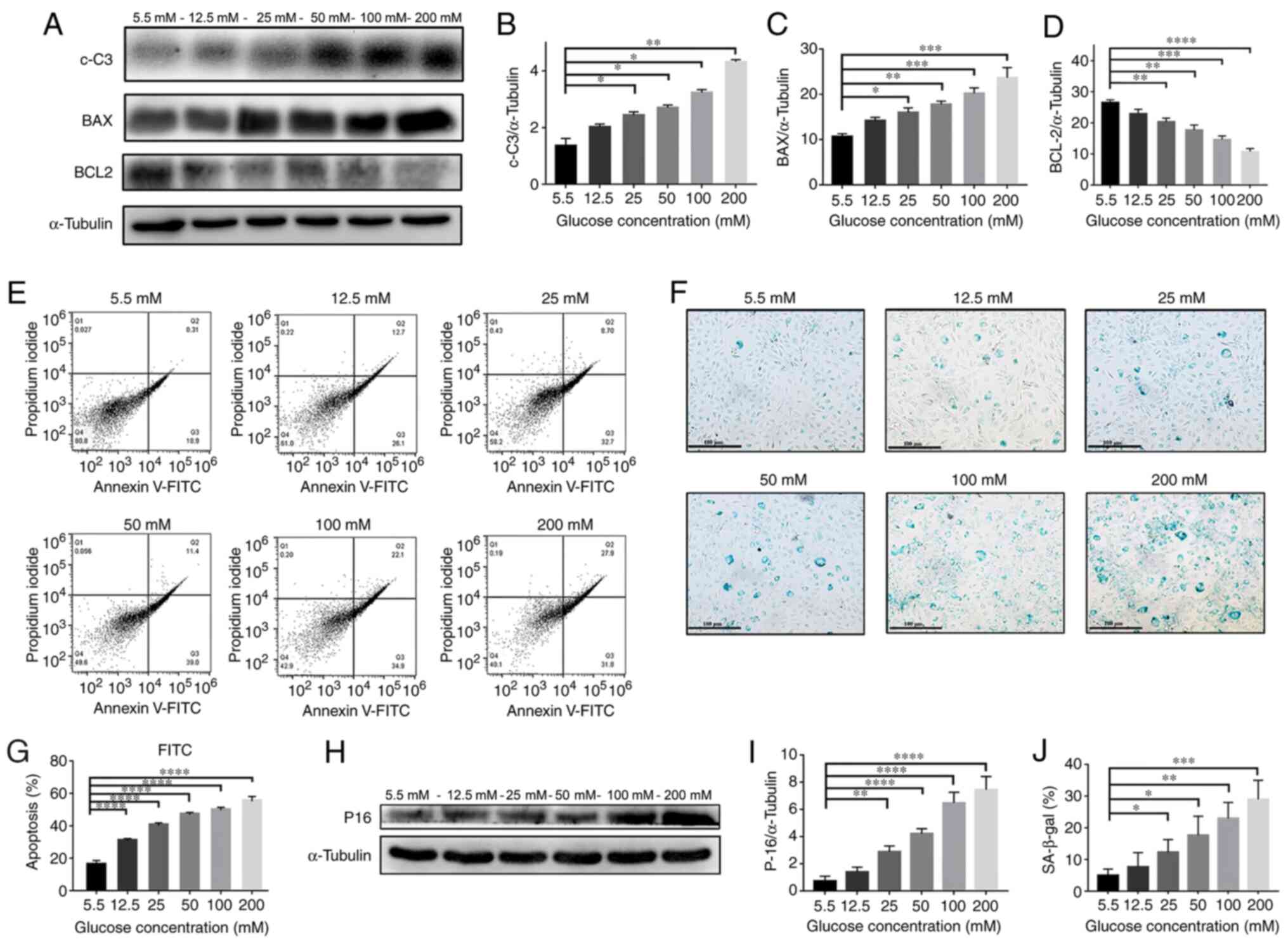 Moreover, as presented in Fig. 3E and G, the percentage of apoptosis as detected by Annexin-V was significantly increased in a glucose dose-dependent manner (P<0.0001). The results of the western blotting in Fig. 3H and I also demonstrated that the expression level of p16 protein was increased in a dose-dependent manner (P<0.01). In addition, the β-Gal staining in Fig. 3F and J indicates a significantly higher percentage of positively stained cells in a glucose concentration-dependent manner (P<0.05) These results demonstrated that high levels of glucose significantly promoted the cellular apoptosis and senescence of NPCs.